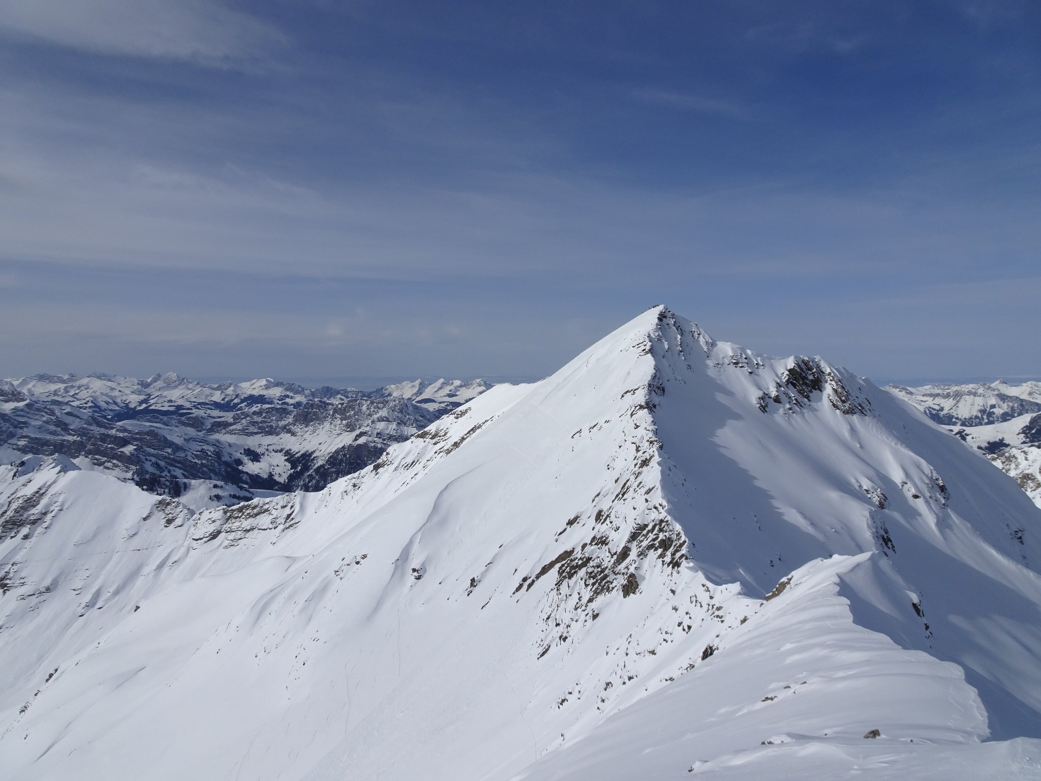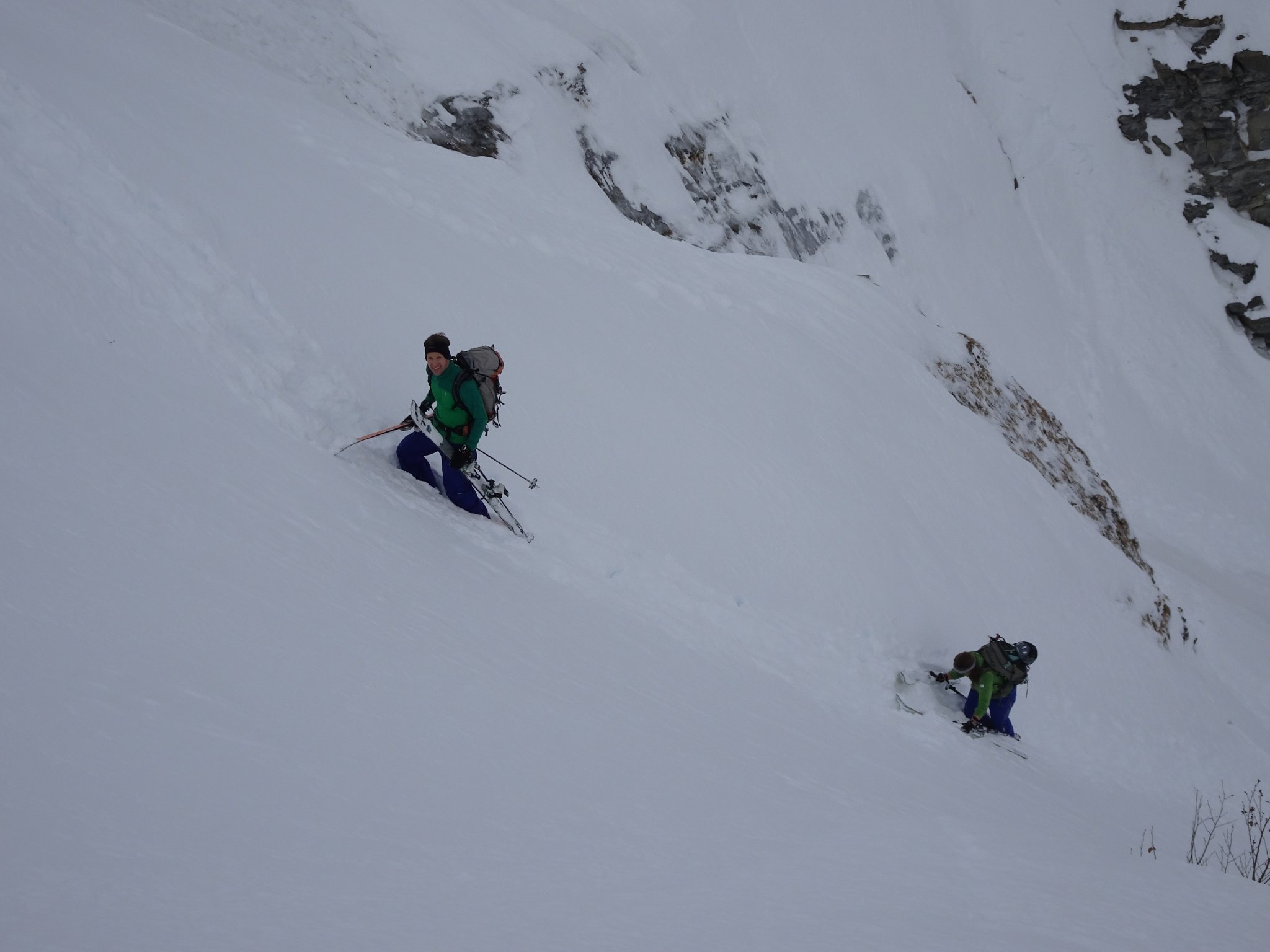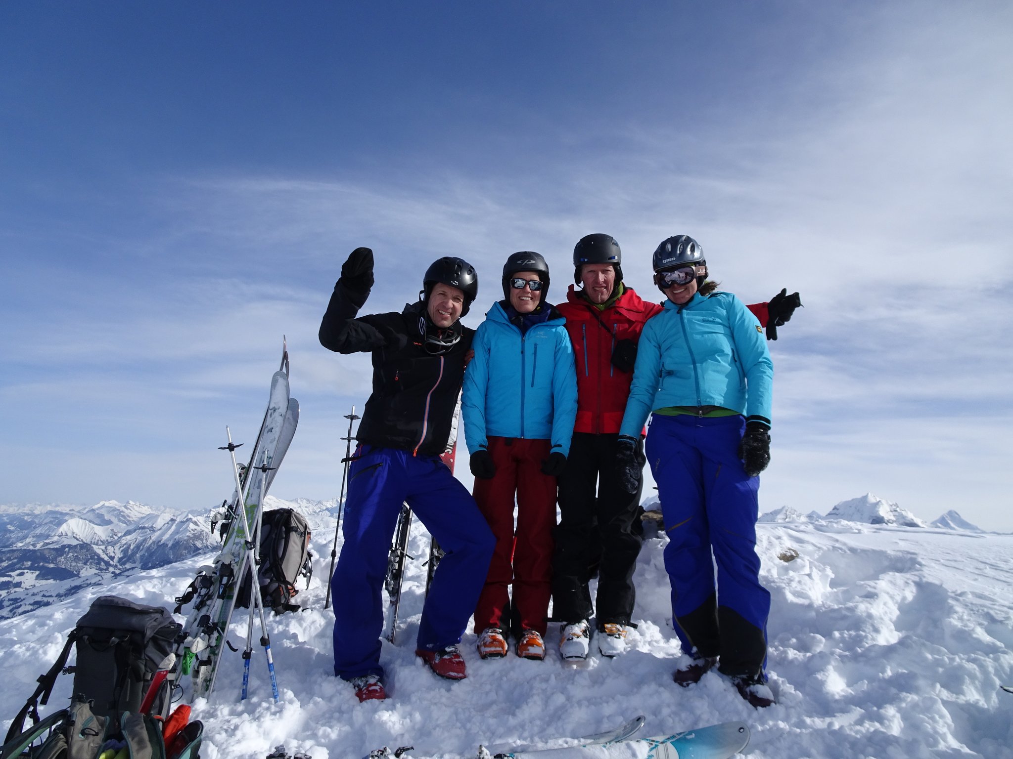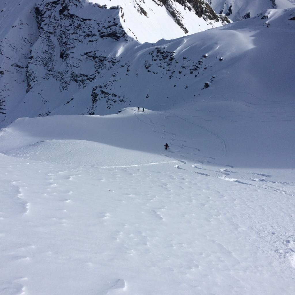 Die Wetterprognosen waren zu mild um den geplanten Aufstieg von der Südseite in Angriff zu nehmen. Deshalb wurde kurzerhand beschlossen von der Nordseite her zu starten. 4 Clübler nahmen die recht lange und ziemlich schwierige Skitour vom Chiru in Angriff. Die Schlüsselstelle beim Wasserfall konnte zu Fuss ohne grössere Schwierigkeiten gemeistert werden. Anschliessend ging es nur noch steil hoch bis zum Gipfel. Zum Glück wurde tags zuvor eine gute und recht steile Aufstiegsspur angelegt. Die anschliessende Abfahrt war ein Genuss. Powder pur und nur wenige Abfahrtspuren (ca. 7 Spuren). Unten im hintersten Chiru angekommen, wurde der Gipfelschnaps eingenommen. Auf dem Gipfel war es unangenehm windig und ein Teilnehmer konnte es kaum erwarten in den tiefen Pulver einzutauchen. Merci Küsel Füglistaller für die super Skitour!