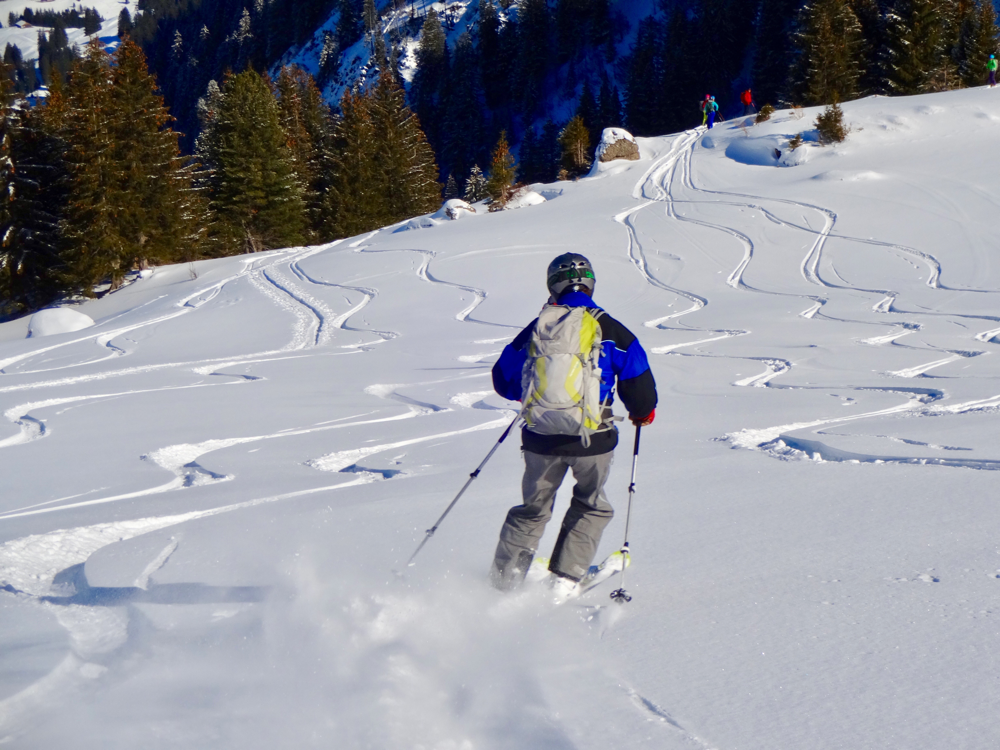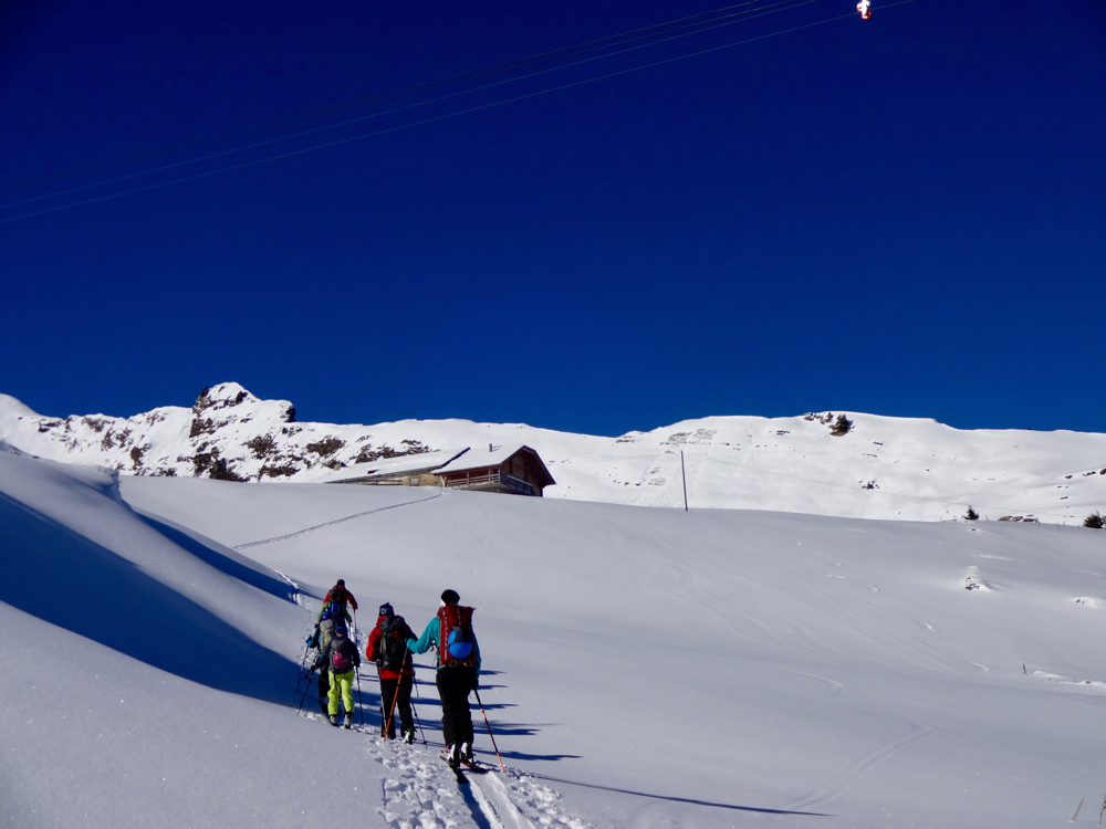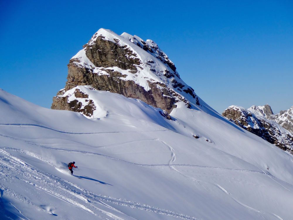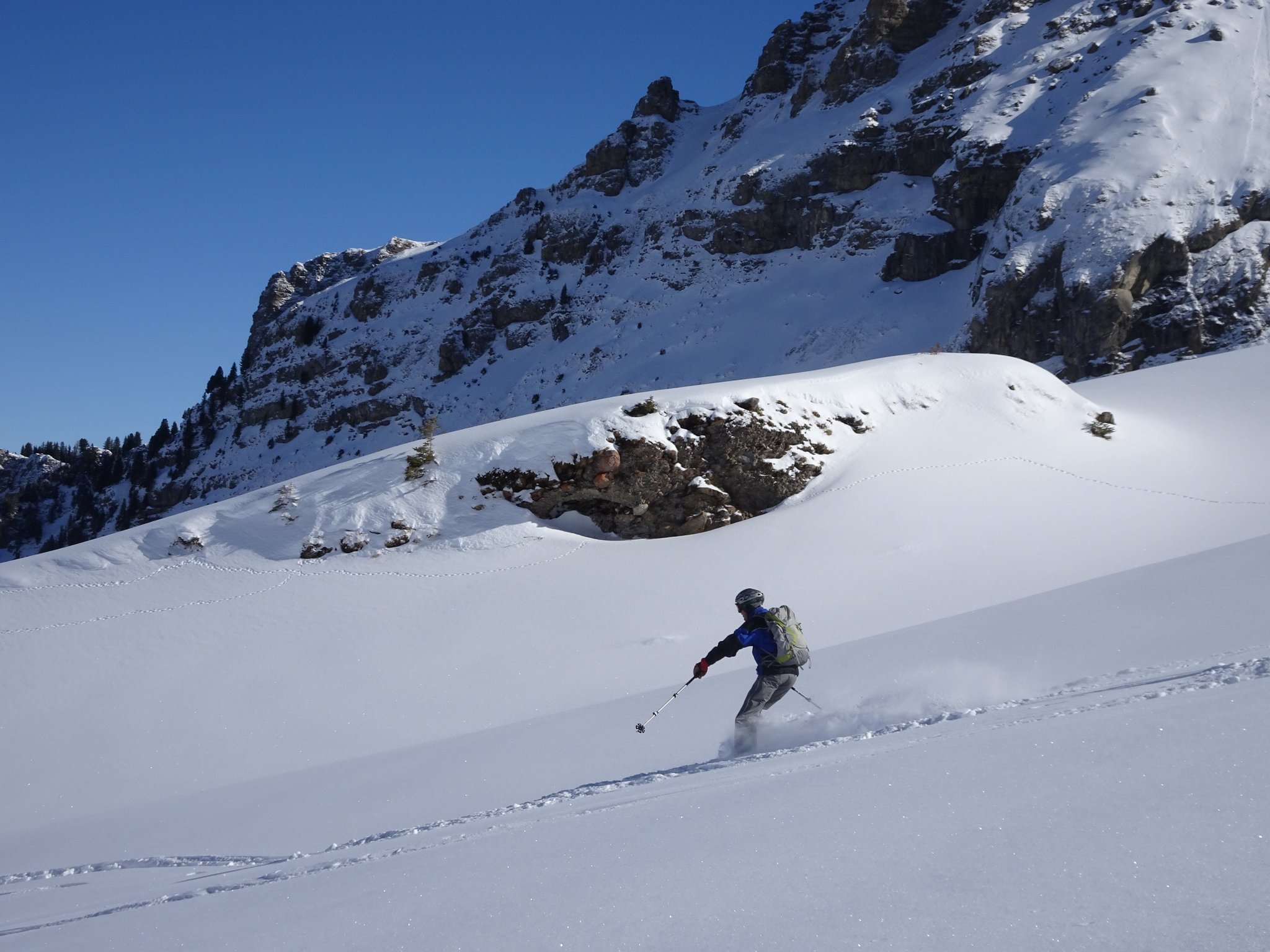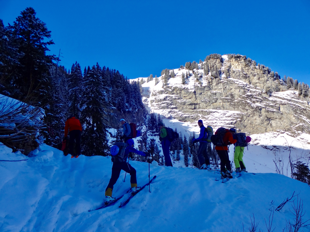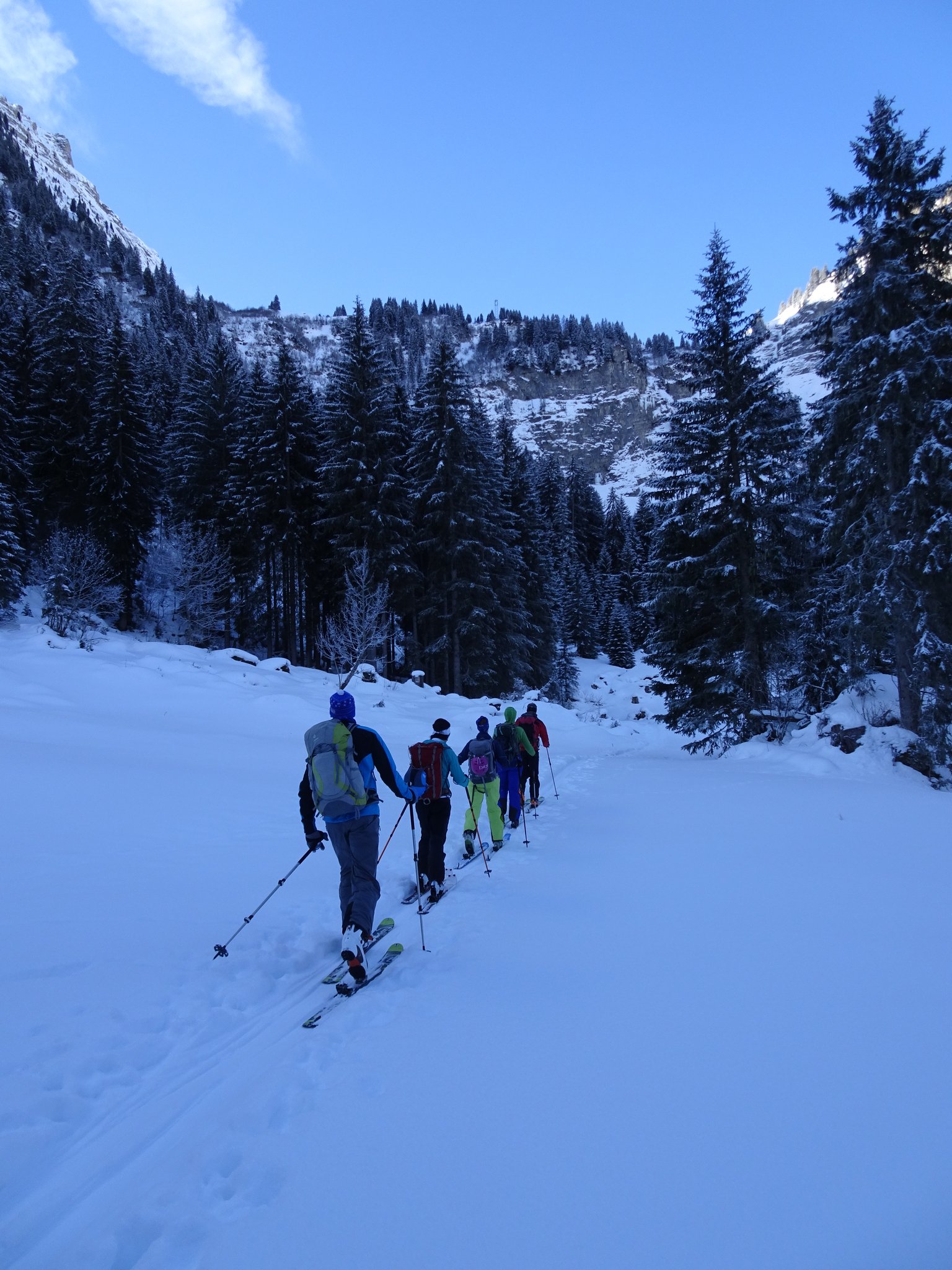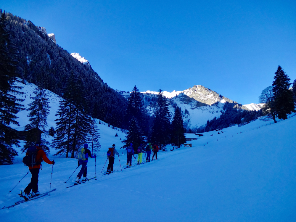 Die Meldung von Roli, die Teilnehmer sollten die Harscheisen nicht vergessen, liess uns ein paar Sorgenfalten auf die Stirn steigen. Sollte die Tour auf das Wittenberghorn - nachdem es im letzten Jahr zu viel Schnee für dieses Tourenziel hatte - wieder scheitern? Wir hofften alle das beste und liessen uns überraschen. Bereits um kurz vor neun ging es los auf einem Strässchen, immer weiter in ein kaltes schattiges Tal hinein. Kurz bevor es dann ruppig bergauf ging, an einem Ort mit dem schönen Namen "Unteres Meieli", spendete uns Roli noch ein Päuschen und liess besagte Harscheisen montieren. Allerdings waren alle Befürchtungen umsonst, denn der Sommerweg hinaus aus dem Tal, hoch auf die Alp "Obere Meiel" war gut gespurt und hatte über Nacht etwas Neuschnee bekommen. Eins zu Null für die Fritschi Harscheisenhochklapper und Dynafit Befehlsverweigerer. Auf der Alp angekommen, lachte uns endlich die berbeigesehnte Sonne an. Wow, war das schön, da musste gleich Pause zwei her um darauf anzustossen! Vor uns lag nun der Schlussaufstieg zum Wittenberghorn in einem praktisch unverfahrenen Gelände. Dieser Ort scheint entweder ein Insidertip zu sein, oder der Sommerweg zeigt sich nur selten von seiner guten Seite und schreckt so viele Tüüreler ab. Wir wissen es nicht. Vielleicht hat Roli auch irgendwo beim Aufstieg nach uns ein Verbotsschild montiert? Jedenfalls war das Gebiet, verglichen mit dem Diemtigtal, fast menschenleer. Bald erreichten wir den Gipfel wo wir uns relativ speditiv abfahrtsbereit machten. Einem Ski ging dies aber immer noch zu langsam und so machte sich dieser ohne seinen Fahrer auf die Socken. Zum Glück blieb er dann kurze Zeit später etwas weiter unten wieder liegen und so konnte der glücklose Pilot zügig wieder zwei Skier anziehen. Die Abfahrt war dann erste Sahne mit super Pulver und unverfahrenen Hängen. So macht es Spass! Wir cruisten zügig wieder zur Alphütte zurück, gönnten uns den hochgeschleppten Imbiss und zischten Susles Schnaps weg. Küsus edler Tropfen musste bereits auf dem Gipfel dran glauben. Soviel Zeit muss dann schon sein auf dem Gipfel - Selfie und Schnäpsli! Nach der Mittagspause folgte dann noch die charakterbildende Abfahrt wieder hinunter ins kalte Tal wo wir hergekommen waren. Gut, Pow war das dort nicht mehr, aber sooo übel wars dann auch wieder nicht. Kurz vor dem Auto ging uns noch beinahe der Schnee aus weil es so warm wurde. Alles in allem war das ein ganz toller Tag mit einer Hammertour. Besten Dank Roli! Bis zum Nordend dann... ;-)