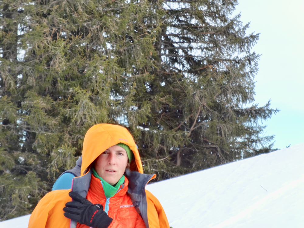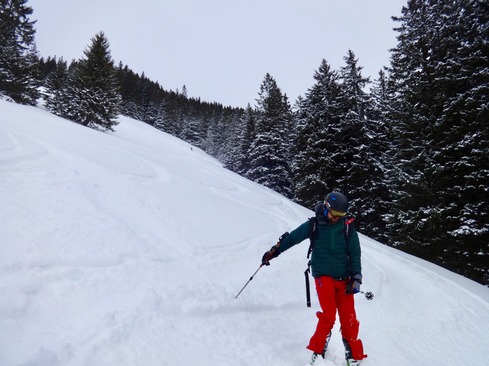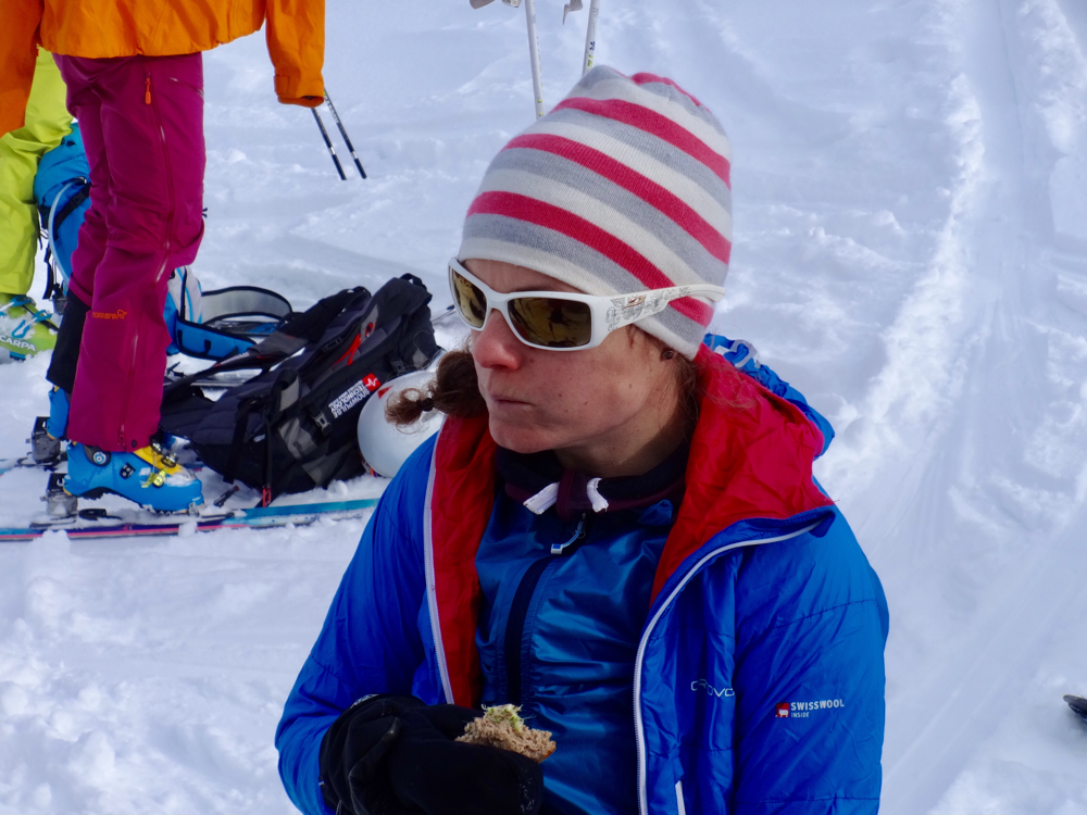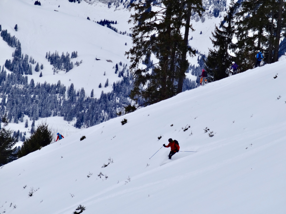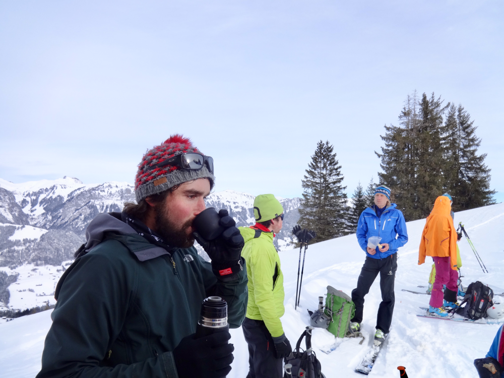 Die Abfahrt war dann erste Sahne! Der Neuschnee des Vortages war immer noch fluffig und toll zu fahren. Alle genossen die herrlichen Schwünge im Pow, jeder mit etwas mehr oder weniger Brand in den Oberschenkeln. Viel zu schnell waren wir wieder fast unten angelangt, da mussten unbedingt noch einige Waghalsige durch den Bach schiinen, obwohl Tourenchef Ädä ganz klar anderweitig kommuniziert hatte. Zur Strafe gab's für einige Bach-Protagonisten Mörderstogle und dadurch eine Schleichfahrt zurück zu Susle, die bereits im Beizli auf uns wartete. Dort gab es nach einer Belehrung, wie man sich als Gruppe gefälligst anzumelden hätte, doch noch ein Kaffee und ein paar der achtzig Nussgipfel. Ich hoffe, sie überleben unseren Überfall! Zurück zum Ausgangspunkt ging es dann alles wieder bergab, entweder mit den Ski, oder per Anhalter mit einem Auto voller Mannsbilder für unsere Schneeschuhläuferin. Wären wir nicht fast gleichzeitig unten gewesen, hätten sie Susle wohl noch ein bisschen behalten? Wer weiss...