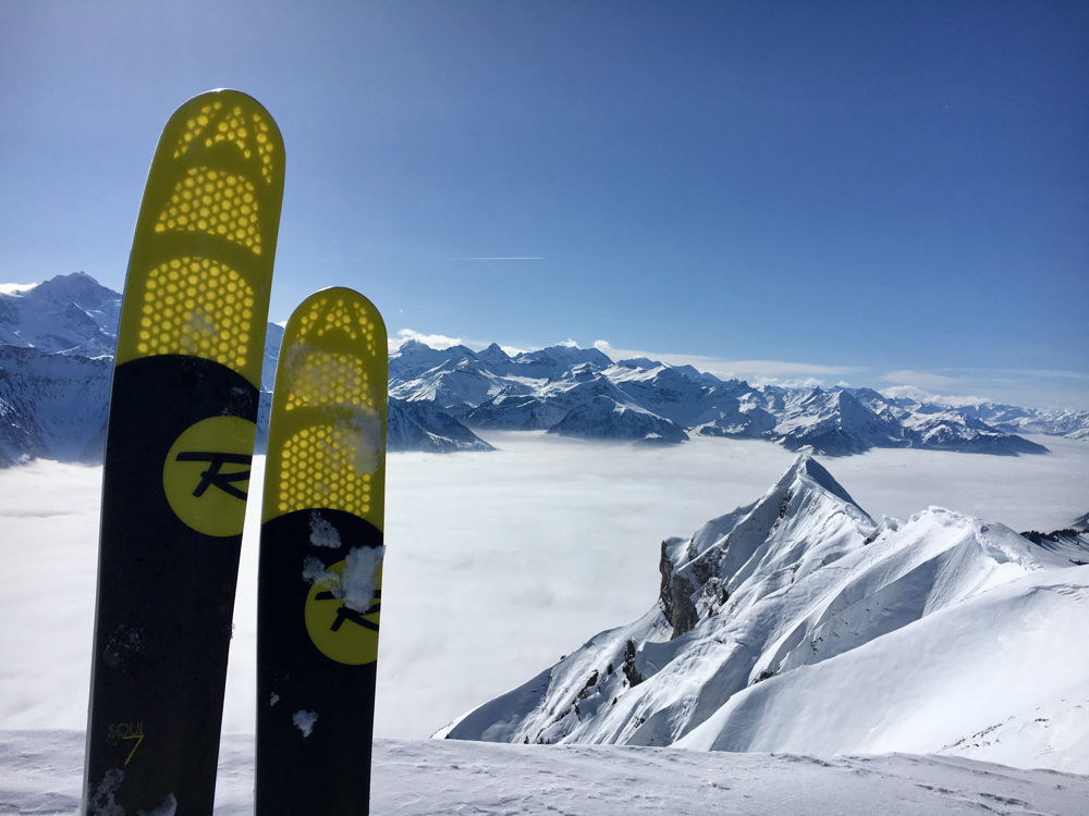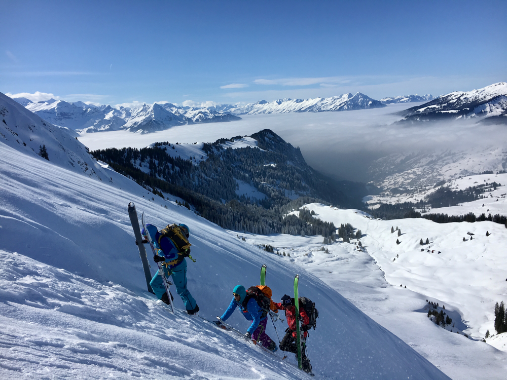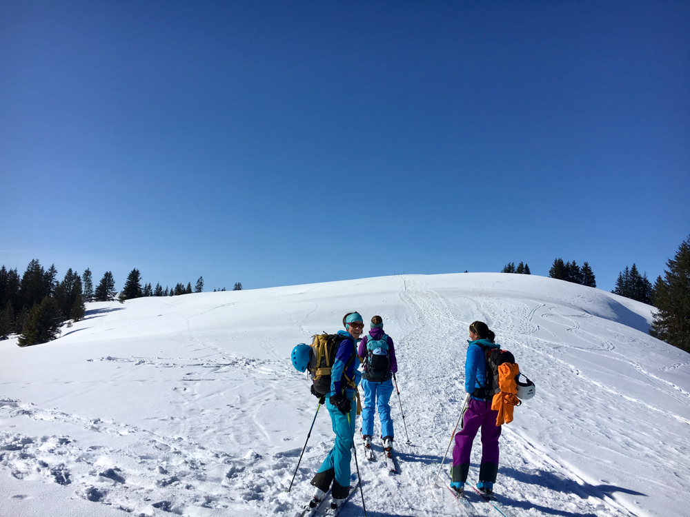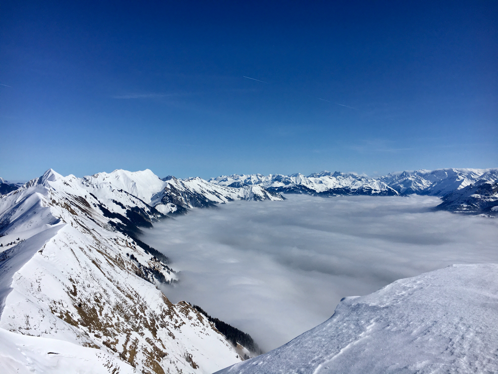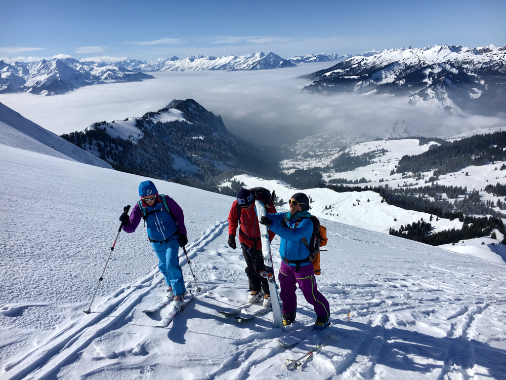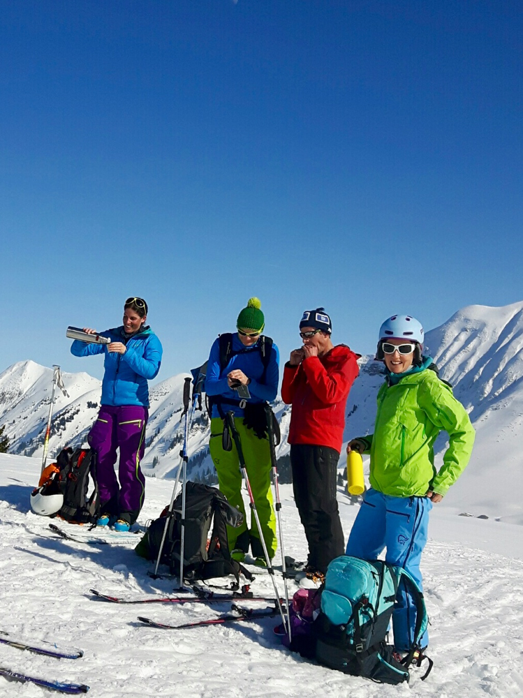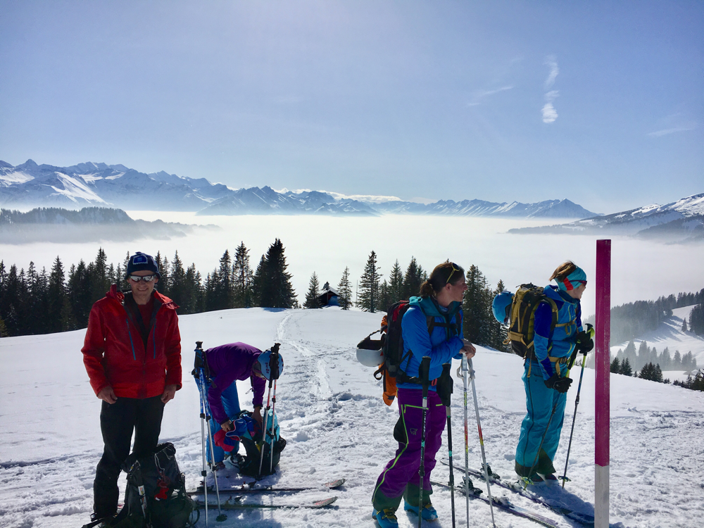 Den Gipfelhang hoch war es wieder toll zum Laufen, jedenfalls für jene Teilnehmer, bei welchen die Felle an den Skiern blieben. Zudem versprach der Schnee hier eine Hammerabfahrt. Spitzkehre um Spitzkehre schraubten wir uns hoch auf den Grat, welchem wir noch kurz folgten, um schliesslich den Gipfel des Augstmatthorn zu erreichen. Jüre von Där.. ehm nein Bönigen, ein sehr freundlicher Kollege den wir beim Aufstieg kennengelernt hatten, erreichte mit uns den Gipfel. Wir haben ihm mit unserem pausenlosen Gequassel wohl nicht das Gipfelerlebnis getrübt. Schoss er doch unser Gipfelselfie und begleitete uns nach der Abfahrt noch ins Kafi. Merci Jüre und noch schöne Touren!