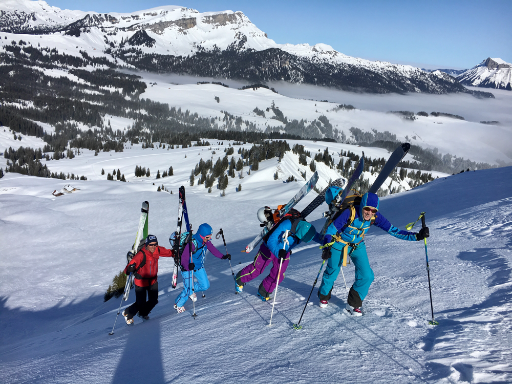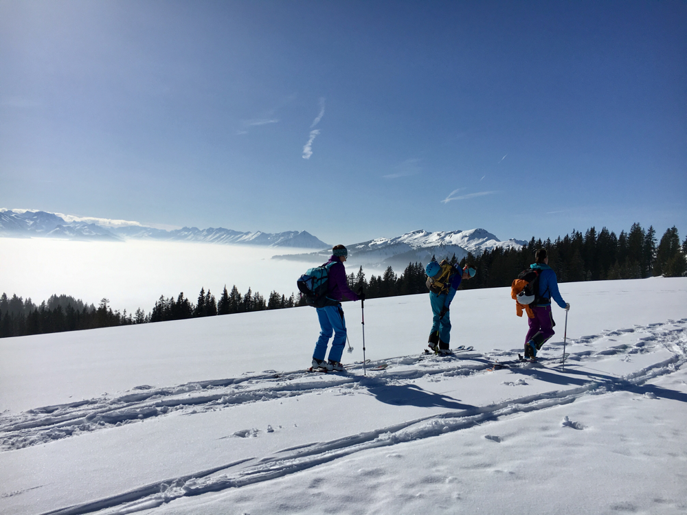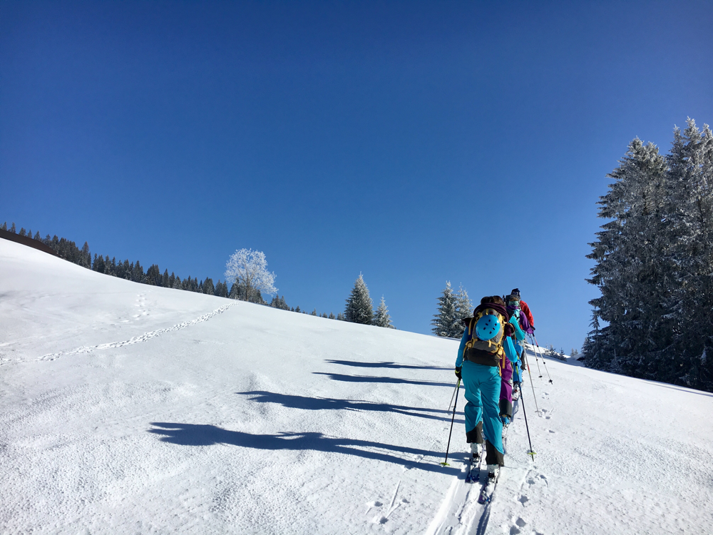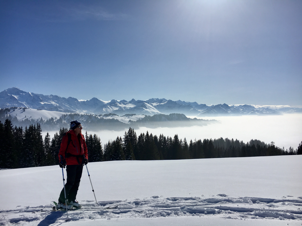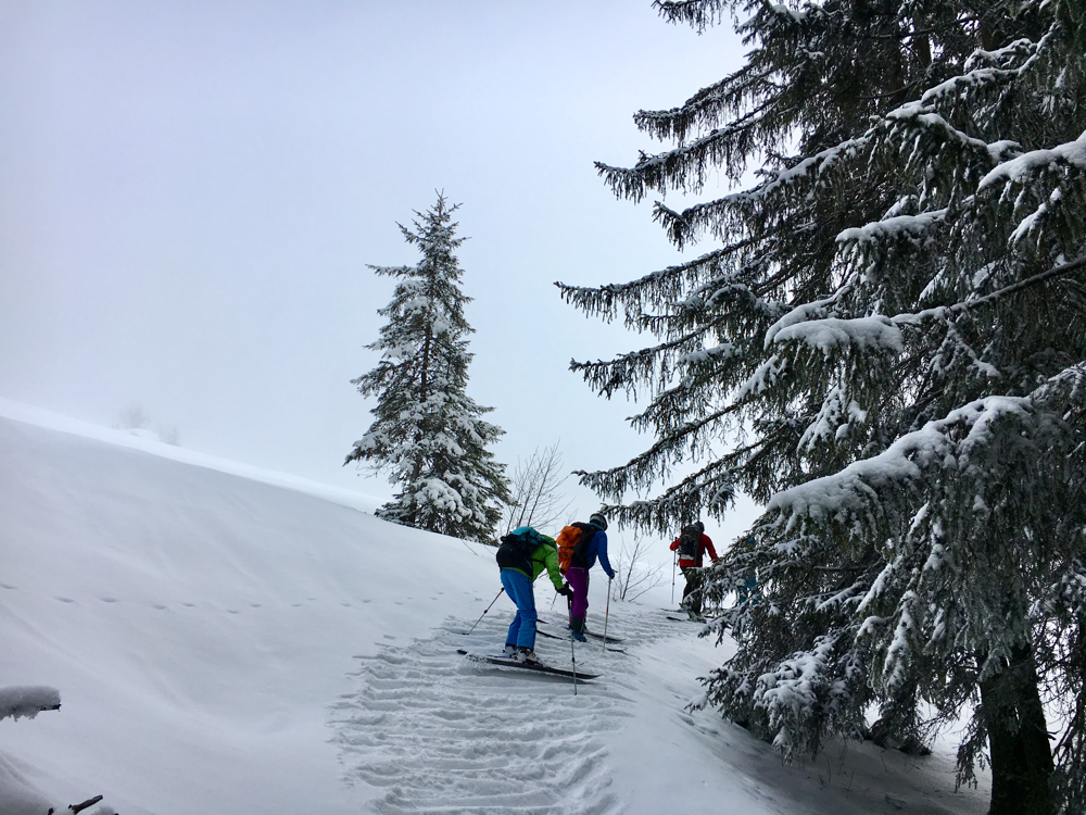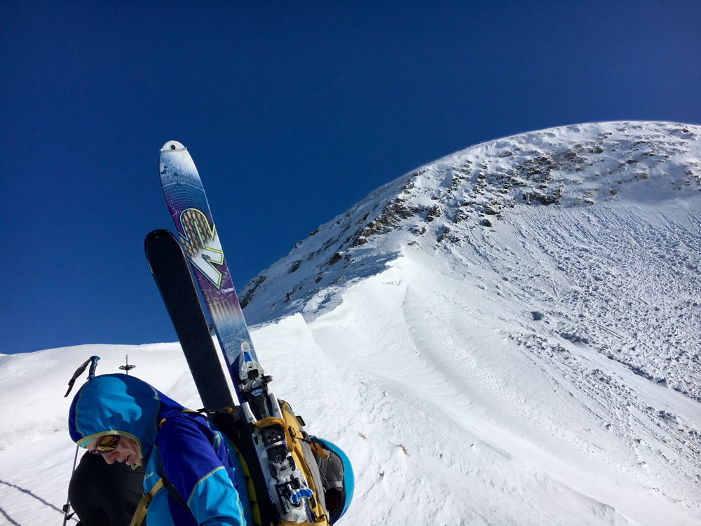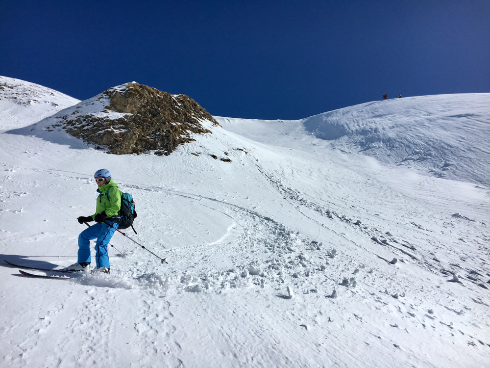 Den Gipfelhang hoch war es wieder toll zum Laufen, jedenfalls für jene Teilnehmer, bei welchen die Felle an den Skiern blieben. Zudem versprach der Schnee hier eine Hammerabfahrt. Spitzkehre um Spitzkehre schraubten wir uns hoch auf den Grat, welchem wir noch kurz folgten, um schliesslich den Gipfel des Augstmatthorn zu erreichen. Jüre von Där.. ehm nein Bönigen, ein sehr freundlicher Kollege den wir beim Aufstieg kennengelernt hatten, erreichte mit uns den Gipfel. Wir haben ihm mit unserem pausenlosen Gequassel wohl nicht das Gipfelerlebnis getrübt. Schoss er doch unser Gipfelselfie und begleitete uns nach der Abfahrt noch ins Kafi. Merci Jüre und noch schöne Touren!