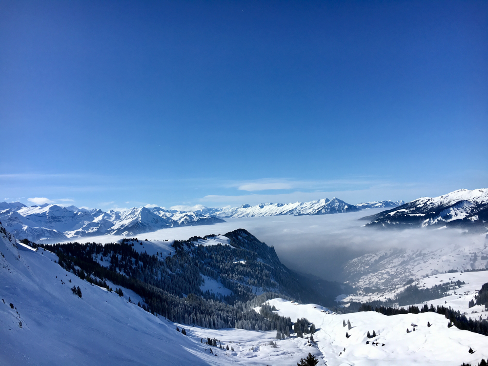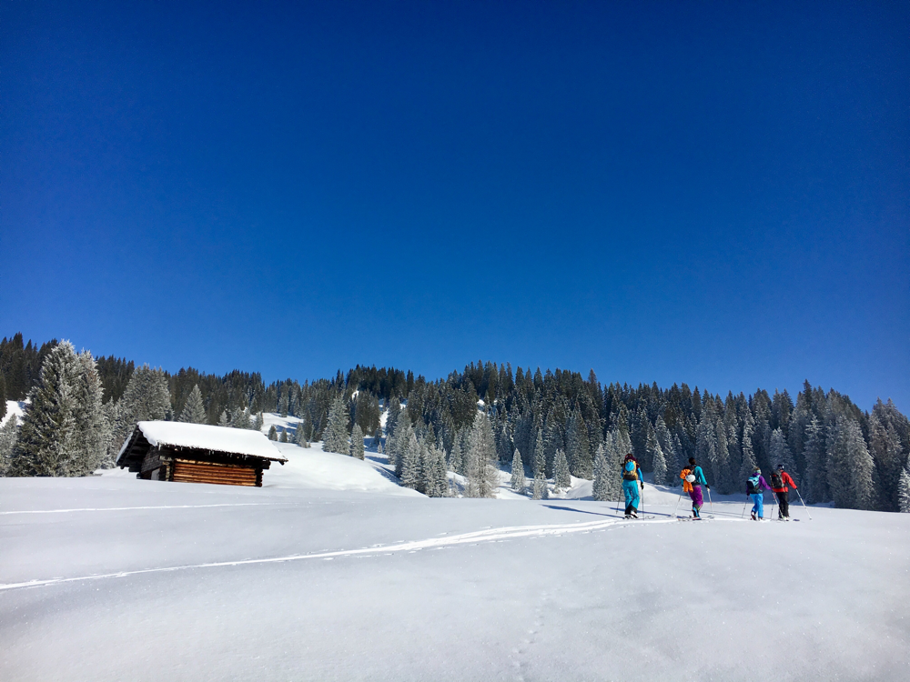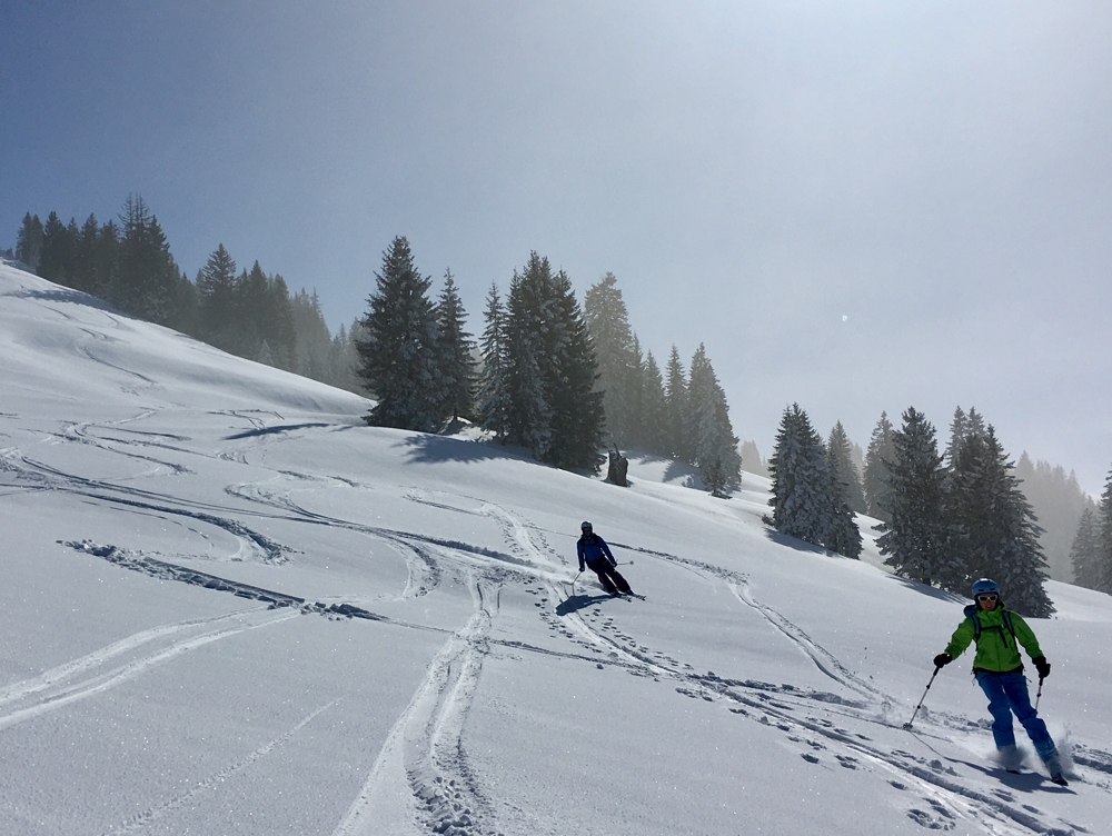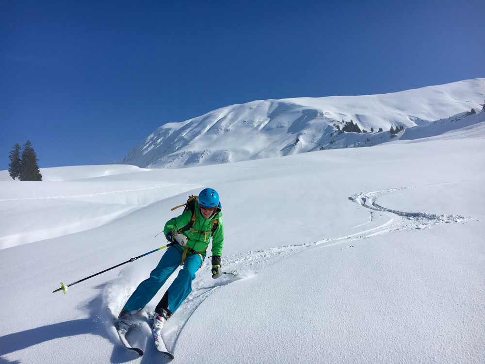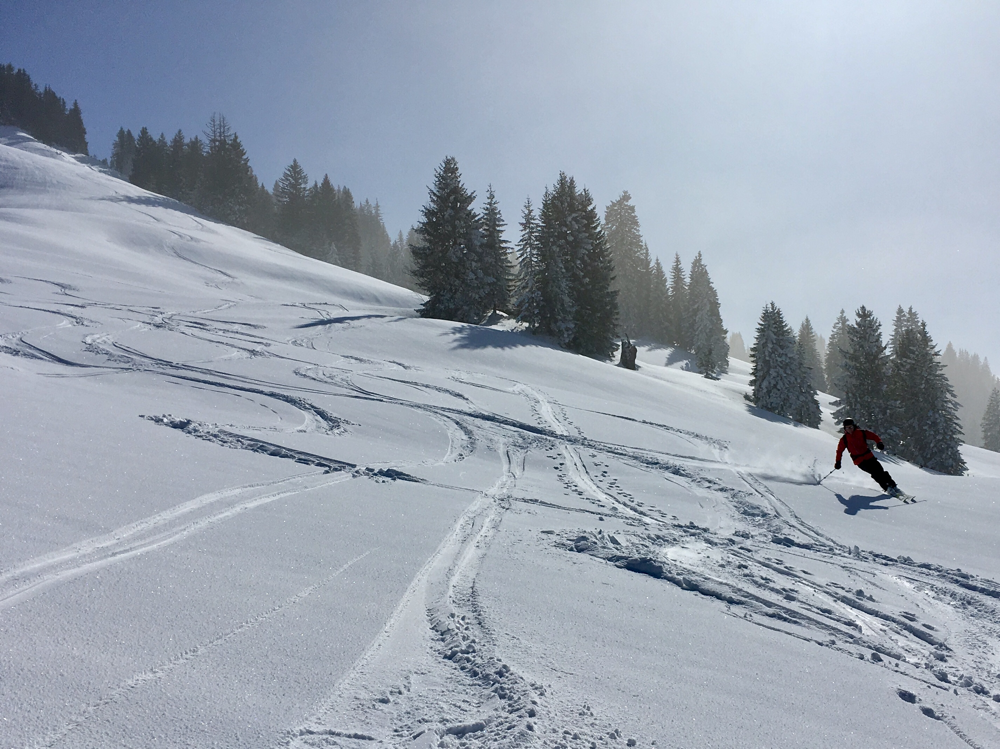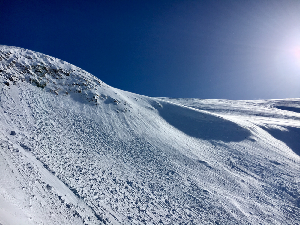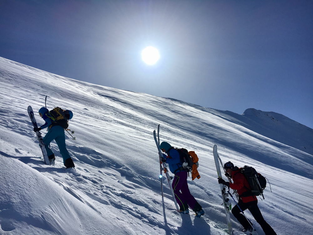 Den Gipfelhang hoch war es wieder toll zum Laufen, jedenfalls für jene Teilnehmer, bei welchen die Felle an den Skiern blieben. Zudem versprach der Schnee hier eine Hammerabfahrt. Spitzkehre um Spitzkehre schraubten wir uns hoch auf den Grat, welchem wir noch kurz folgten, um schliesslich den Gipfel des Augstmatthorn zu erreichen. Jüre von Där.. ehm nein Bönigen, ein sehr freundlicher Kollege den wir beim Aufstieg kennengelernt hatten, erreichte mit uns den Gipfel. Wir haben ihm mit unserem pausenlosen Gequassel wohl nicht das Gipfelerlebnis getrübt. Schoss er doch unser Gipfelselfie und begleitete uns nach der Abfahrt noch ins Kafi. Merci Jüre und noch schöne Touren!