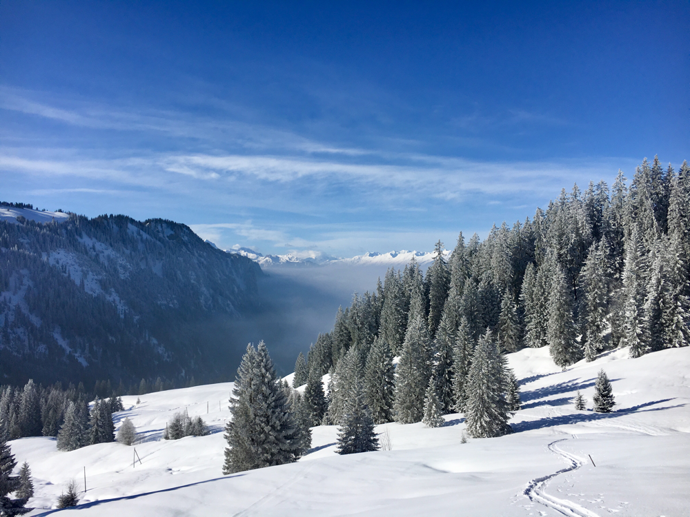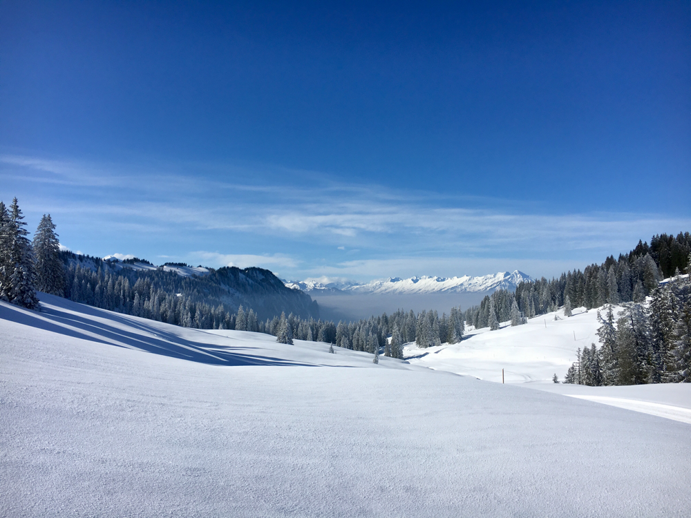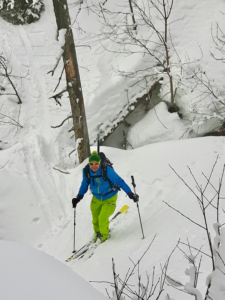 Was nun folgte, war noch das Adventurepaket, welches alle Teilnehmer automatisch und unwissentlich mit gebucht hatten. Der relativ kurze Gegenanstieg zum Winterröscht versprach eine viel spannendere Abfahrt zurück zum Auto. Soviel war zumindest aus der Karte herauszulesen. Die ersten Schwünge hielten dann auch noch, was wir uns ausgerechnet hatten. Doch als wir in den Nabel abtauchten, begann das Drama. Was auf der Karte als eher einfache Querung durch leicht bewaldete Wiesen ausgesehen hatte, entpuppte sich im Nebel und durch das Durchschreiten von zahlreichen tiefen Bachläufen als wahrer Spiessrutenlauf. Wir "Stäggleten" hoch und runter was das Zeug hielt und erreichten etwas K.O und mit reichlich Verspätung schlussendlich doch noch das rettende Auto. Wir müssen dem Augstmatthorn wohl eingestehen, dass es zum Schluss noch zum 1:1 ausgeglichen hat. Klingt fair, würde ich sagen.