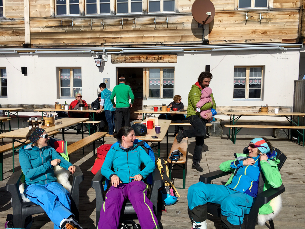 Nach einer ausgedehnten Gipfelrast und nachdem wir Kusi's Schnaps leergesoffen hatten, war es Zeit für die Abfahrt. Der Gipfelhang hatte nicht zu viel versprochen. Kompetent wurden schöne Schwünge gezogen. Im flachen Mittelteil folgte dann schon von der Sonne angefaulter Nassschnee, aber zum Schluss war's noch einmal der Hammer. Viel zu schnell waren wir unten auf der Lombachalp in der Beiz, von wo aus wir von einigen "Spieglern" die ganze Zeit unter kritischer Beobachtung gestanden hatten. Dort trafen wir auch auf Ädä und Familie, die sich einen gemütlichen Tag an der Sonne gönnten.