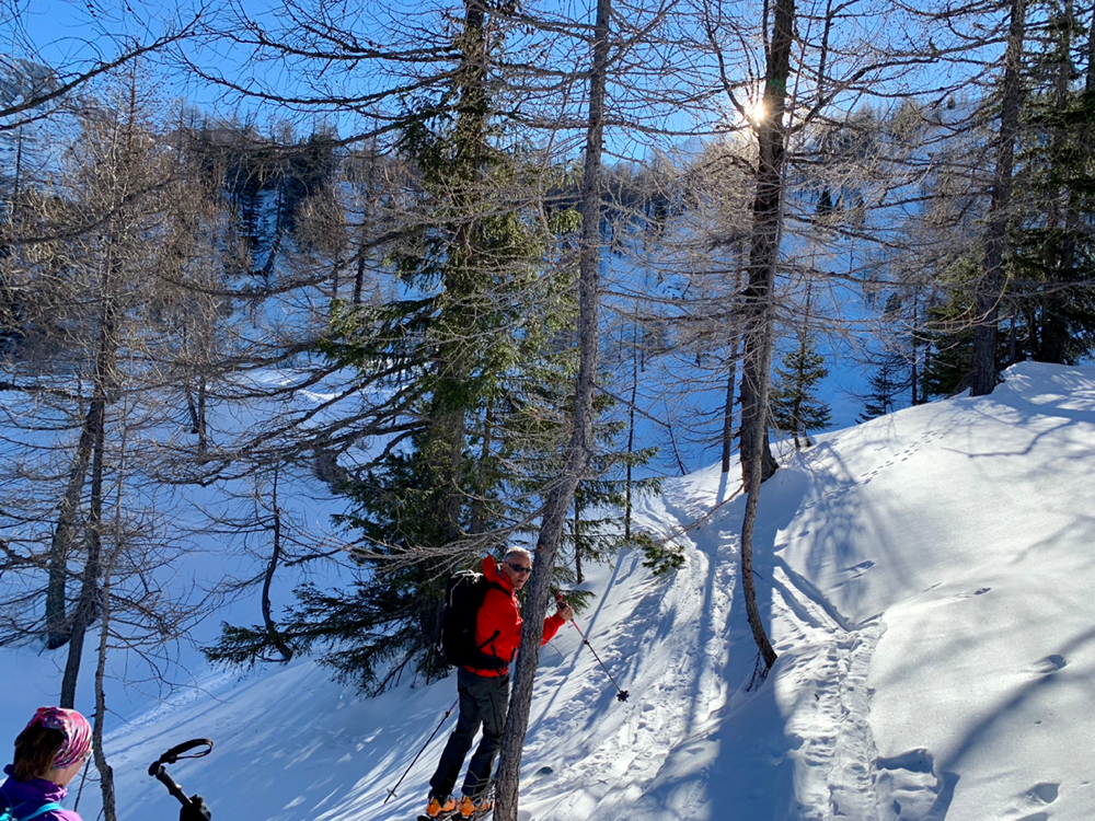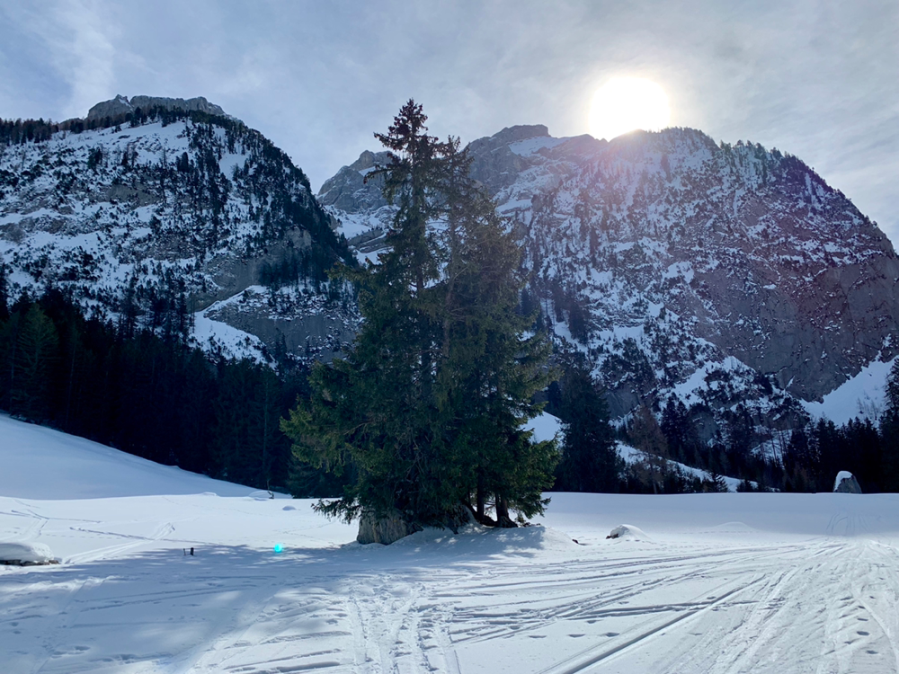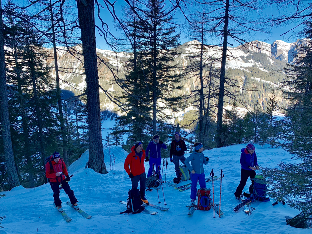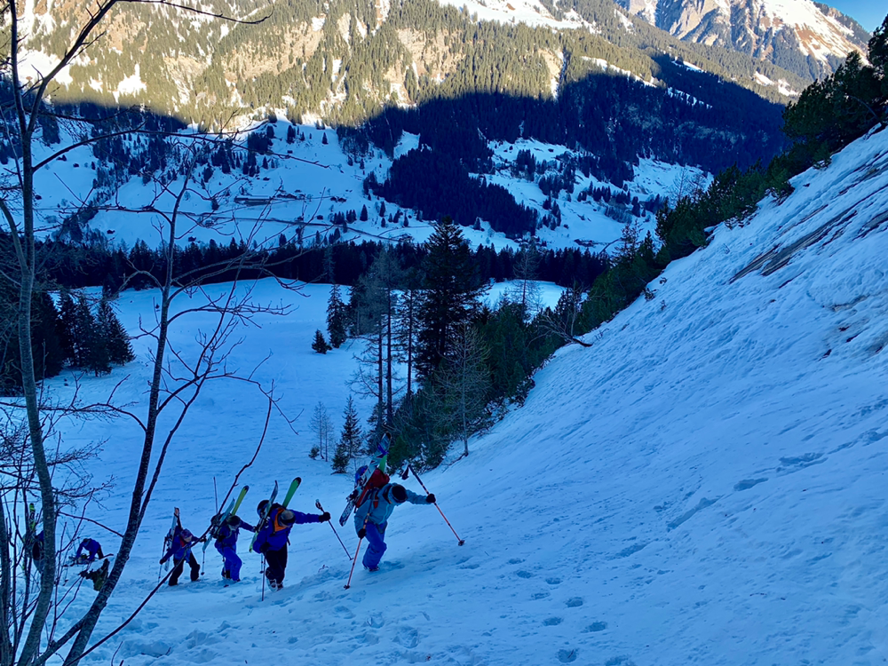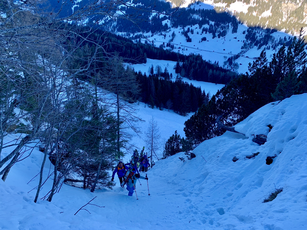 Recht bald standen wir dann vor einem Aufschwung, bei welchem im Tourenbuch die Linie durch Punkte ersetzt wird und mit Skiern an den Füssen definitiv kein Vorwärtskommen mehr möglich war. Also banden wir die Bretter an den Rucksack und erklommen diesen Teil der Route zu Fuss. Bald wurde es wieder flacher und die Ski landeten wieder an den Füssen, wo sie sich nach einer kurzen Pause durch ein Wäldchen hoch arbeiteten bis wir endlich von den ersten Sonnenstrahlen begrüsst wurden. An dieser Stelle öffnete sich plötzlich eine grosse, herrlich verschneite Hochebene, welche zwar immer noch anstieg, jedoch längst nicht mehr so steil wie bisher. Und an deren Ende ragte bereits unser Tourenziel, das Gstellihorn auf.