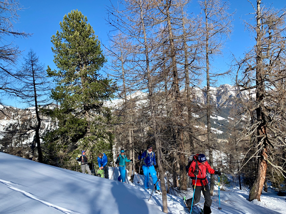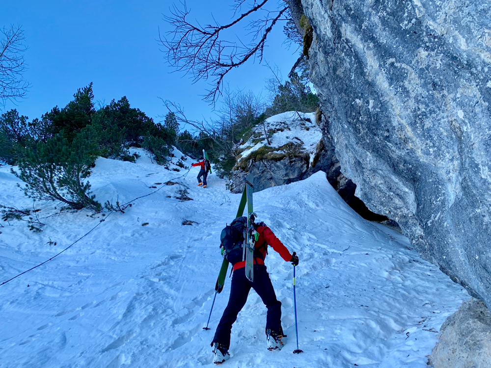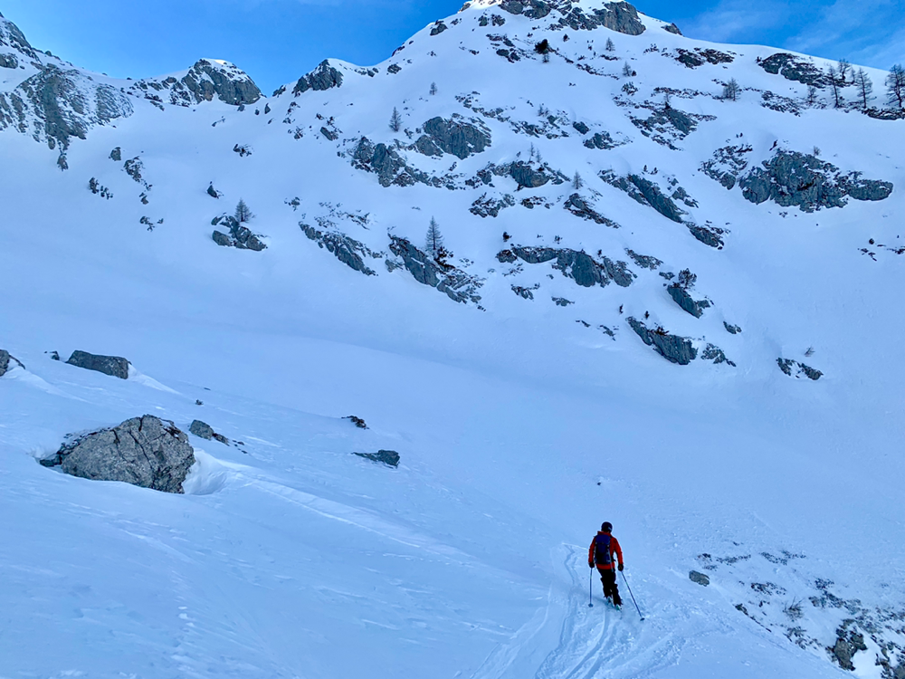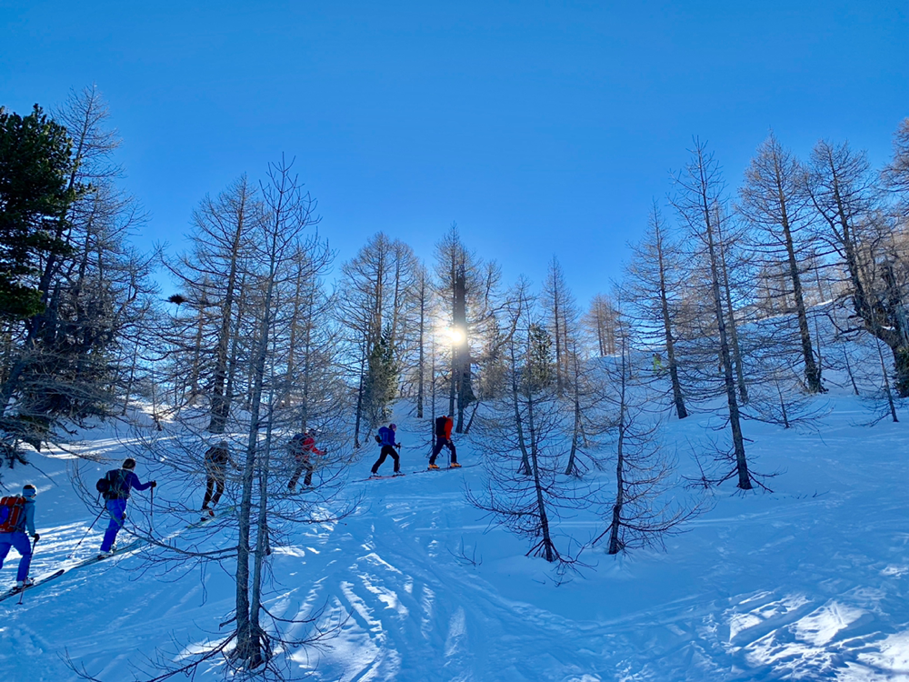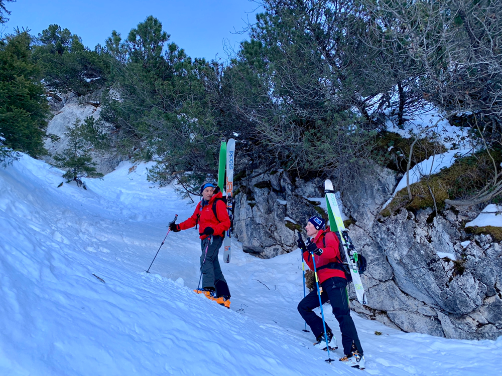 Recht bald standen wir dann vor einem Aufschwung, bei welchem im Tourenbuch die Linie durch Punkte ersetzt wird und mit Skiern an den Füssen definitiv kein Vorwärtskommen mehr möglich war. Also banden wir die Bretter an den Rucksack und erklommen diesen Teil der Route zu Fuss. Bald wurde es wieder flacher und die Ski landeten wieder an den Füssen, wo sie sich nach einer kurzen Pause durch ein Wäldchen hoch arbeiteten bis wir endlich von den ersten Sonnenstrahlen begrüsst wurden. An dieser Stelle öffnete sich plötzlich eine grosse, herrlich verschneite Hochebene, welche zwar immer noch anstieg, jedoch längst nicht mehr so steil wie bisher. Und an deren Ende ragte bereits unser Tourenziel, das Gstellihorn auf.