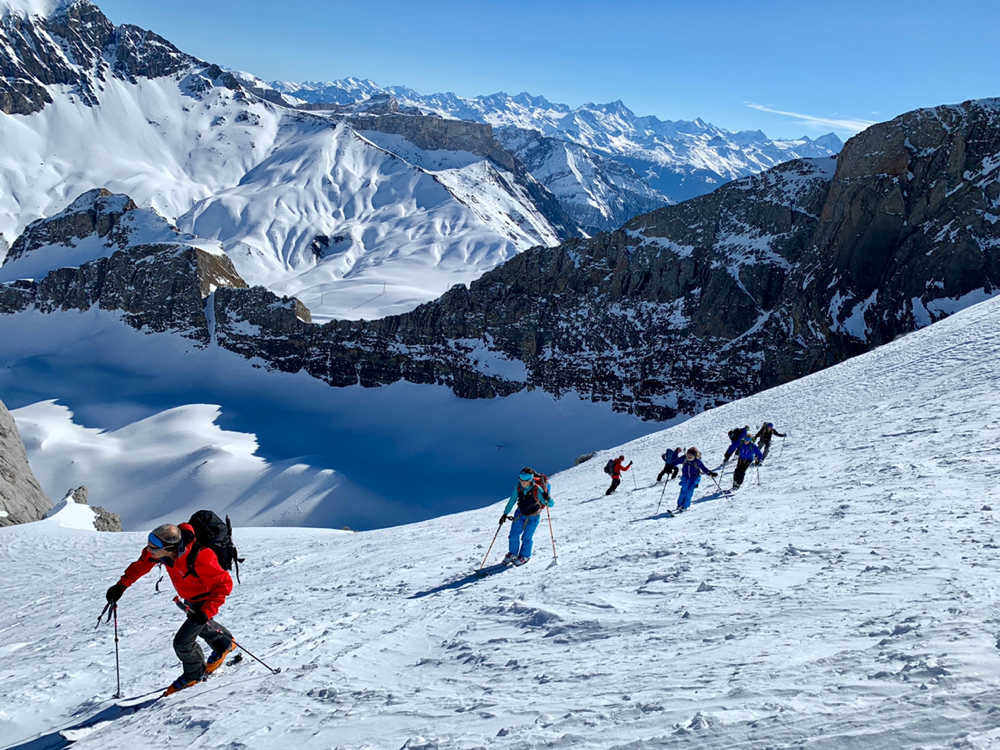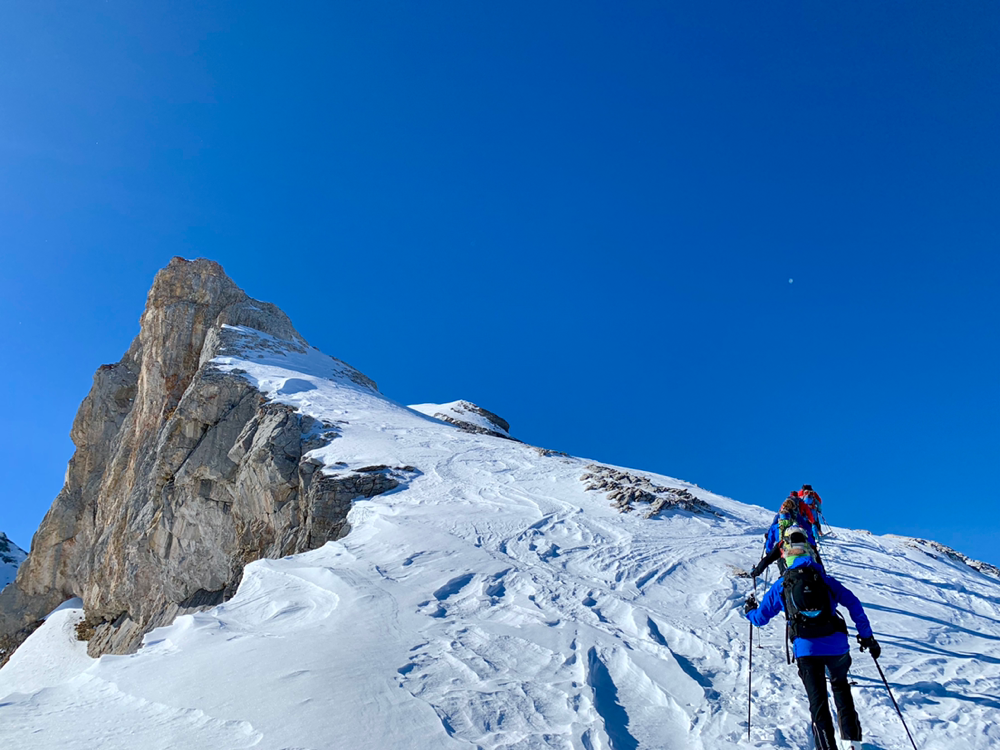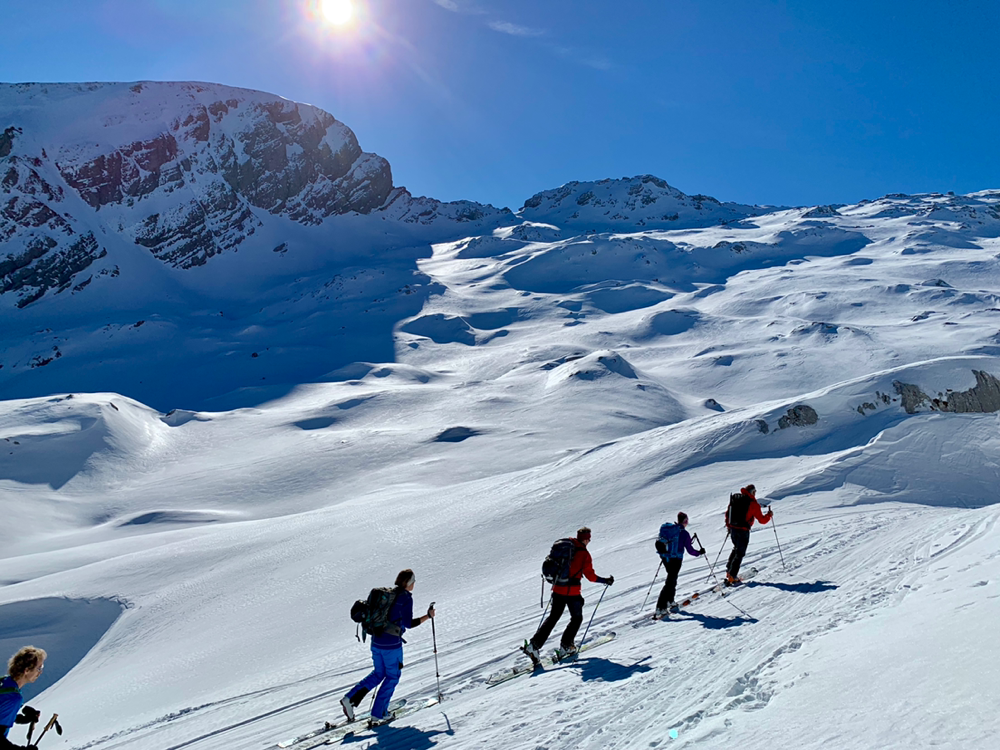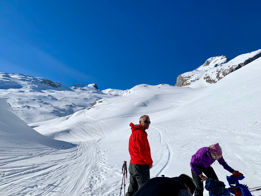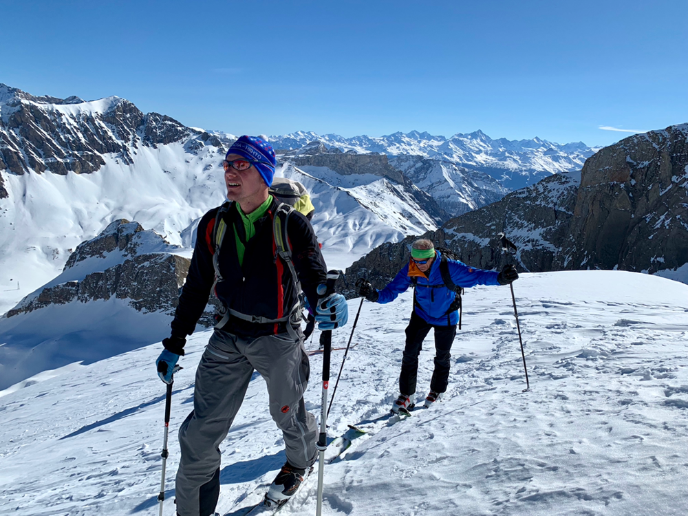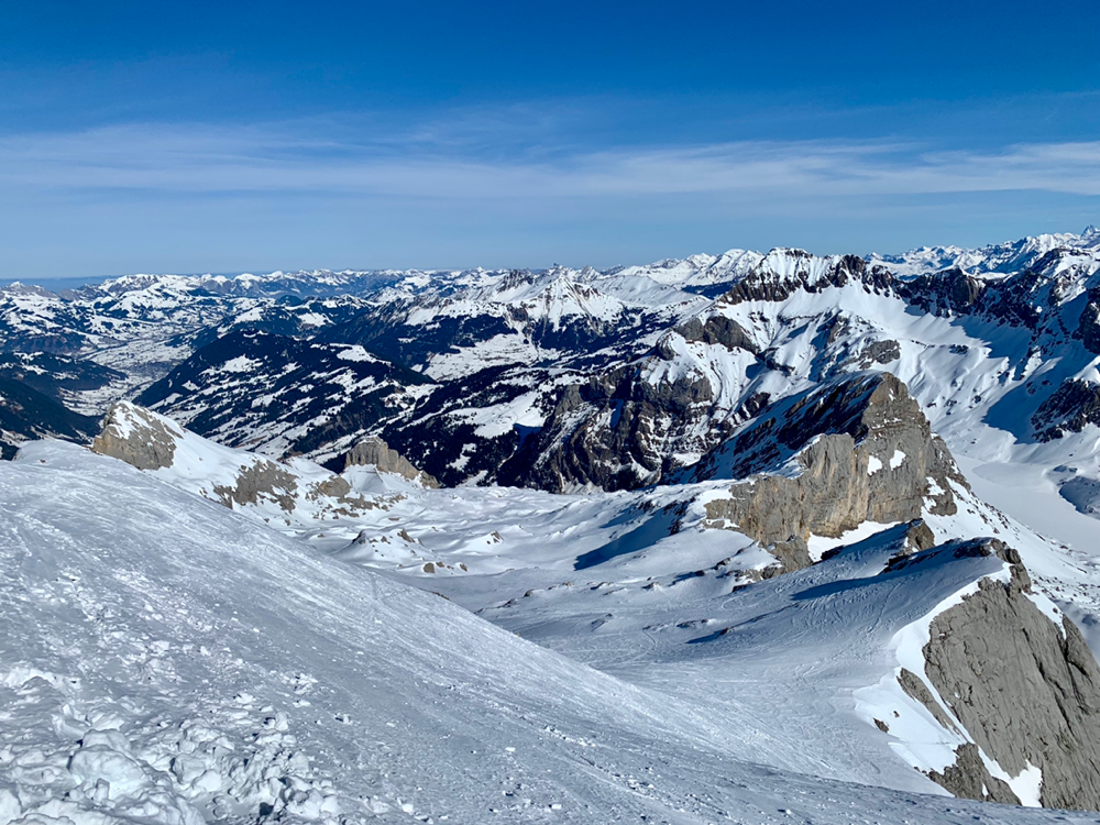Die Sonne war von nun an unser ständiger Begleiter und wir genossen die Wärme. Der Untergrund war hier von unseren Vorgängern und vom Wind schon recht in die Mangel genommen worden und von Neuschnee war keine Spur mehr zu sehen. Zum Hochsteigen ging das aber problemlos und eine Pause später bogen wir bereits in den etwas steileren Gipfelhang ein, wo der Wind spürbar auffrischte. Oben auf dem Gipfel angekommen staunten wir ab der tollen Aussicht. In die eine Richtung blickten wir ins Skigebiet Les Diablerets hinunter und in die andere Richtung auf den Sanetschpass. Alles umgeben von einer tollen Gipfelwelt. Wow, war das schön! Es hatten noch nicht mal alle die Skier abgeschnallt, wurde bereits das obligatorische Gipfelschnäpschen herumgereicht. Beat und Niggäs milchige Mischung war besonders lecker! Merci!