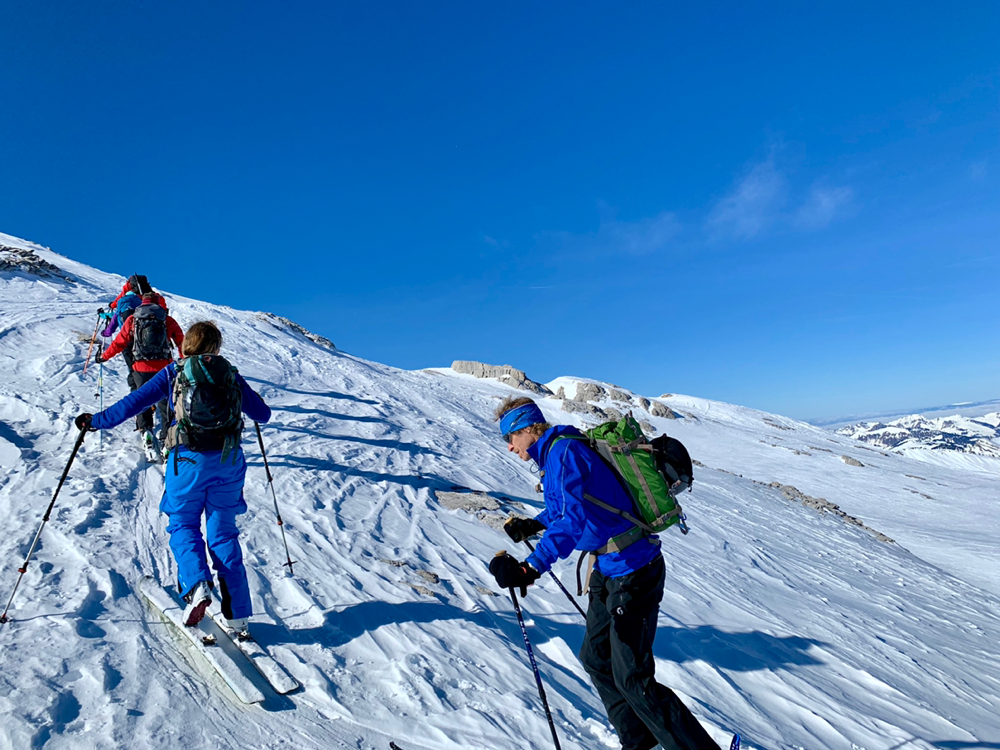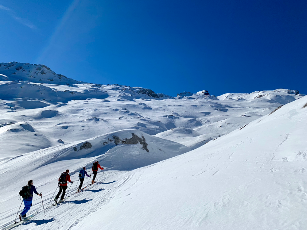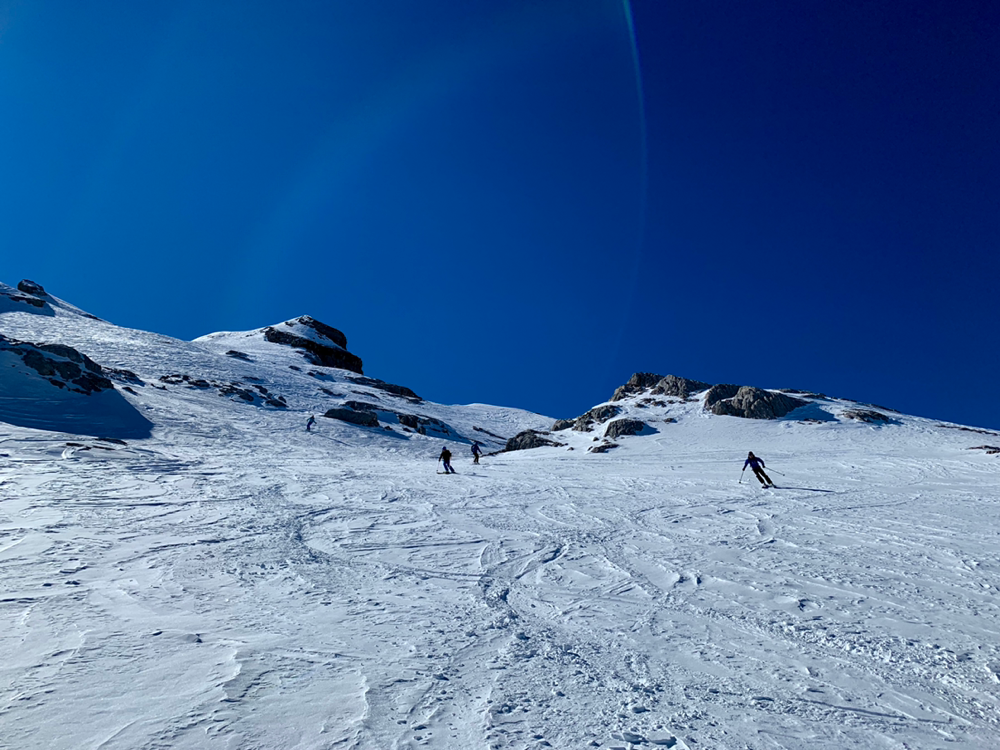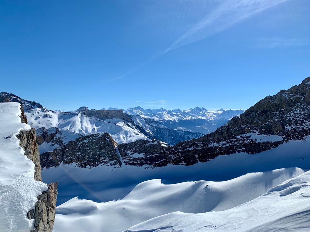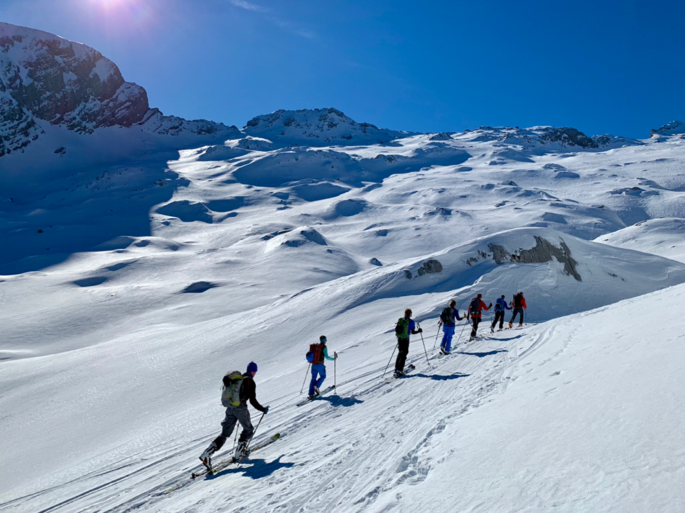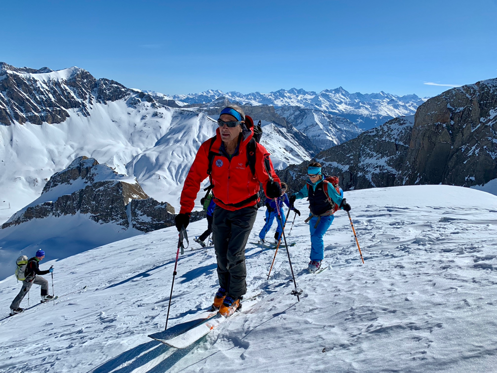 Die Sonne war von nun an unser ständiger Begleiter und wir genossen die Wärme. Der Untergrund war hier von unseren Vorgängern und vom Wind schon recht in die Mangel genommen worden und von Neuschnee war keine Spur mehr zu sehen. Zum Hochsteigen ging das aber problemlos und eine Pause später bogen wir bereits in den etwas steileren Gipfelhang ein, wo der Wind spürbar auffrischte. Oben auf dem Gipfel angekommen staunten wir ab der tollen Aussicht. In die eine Richtung blickten wir ins Skigebiet Les Diablerets hinunter und in die andere Richtung auf den Sanetschpass. Alles umgeben von einer tollen Gipfelwelt. Wow, war das schön! Es hatten noch nicht mal alle die Skier abgeschnallt, wurde bereits das obligatorische Gipfelschnäpschen herumgereicht. Beat und Niggäs milchige Mischung war besonders lecker! Merci!