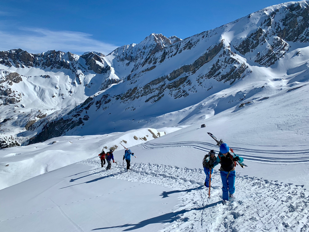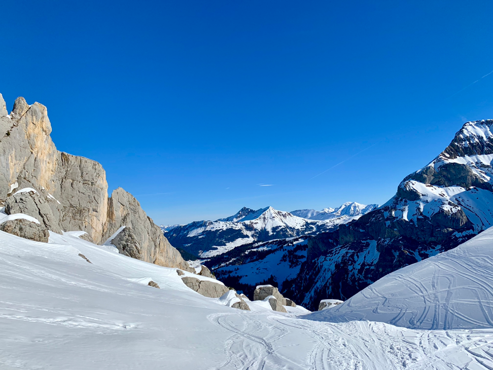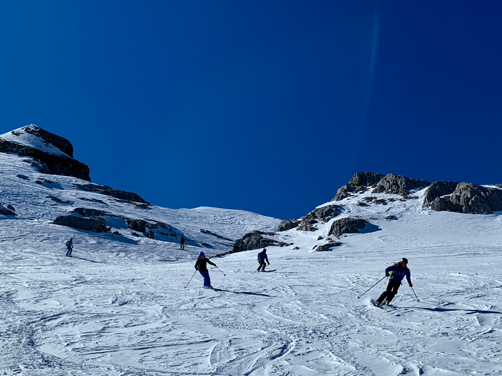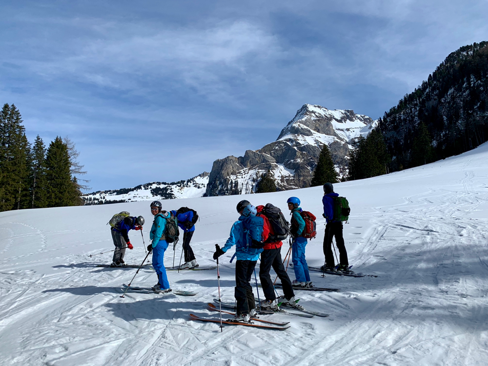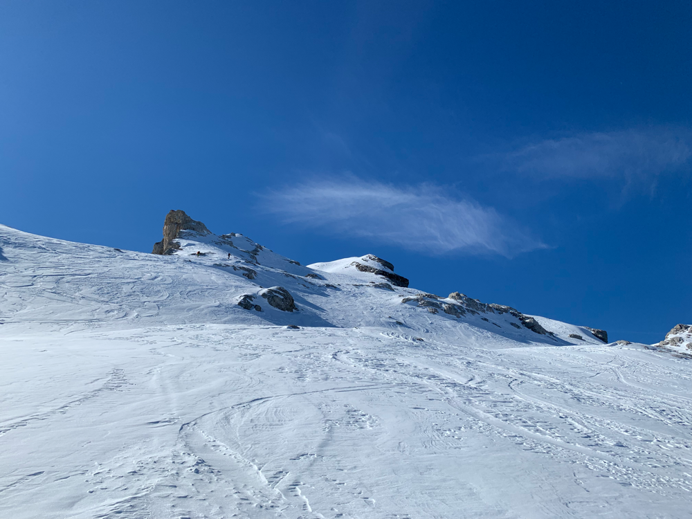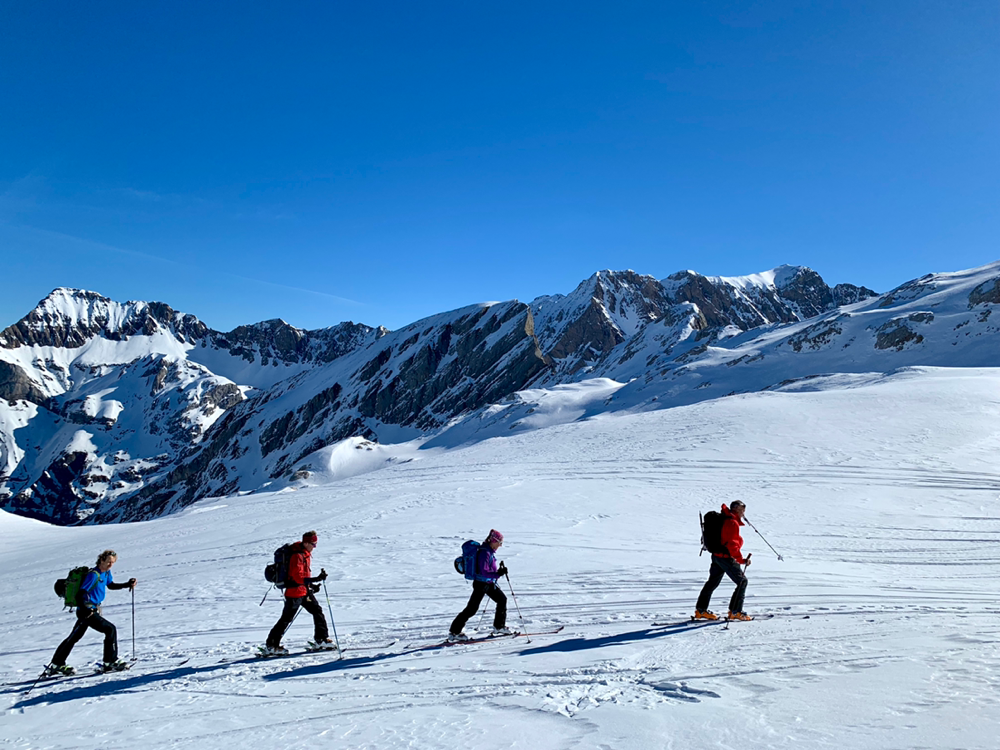 Die Sonne war von nun an unser ständiger Begleiter und wir genossen die Wärme. Der Untergrund war hier von unseren Vorgängern und vom Wind schon recht in die Mangel genommen worden und von Neuschnee war keine Spur mehr zu sehen. Zum Hochsteigen ging das aber problemlos und eine Pause später bogen wir bereits in den etwas steileren Gipfelhang ein, wo der Wind spürbar auffrischte. Oben auf dem Gipfel angekommen staunten wir ab der tollen Aussicht. In die eine Richtung blickten wir ins Skigebiet Les Diablerets hinunter und in die andere Richtung auf den Sanetschpass. Alles umgeben von einer tollen Gipfelwelt. Wow, war das schön! Es hatten noch nicht mal alle die Skier abgeschnallt, wurde bereits das obligatorische Gipfelschnäpschen herumgereicht. Beat und Niggäs milchige Mischung war besonders lecker! Merci!
