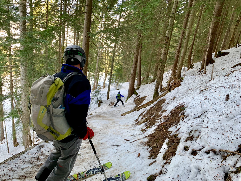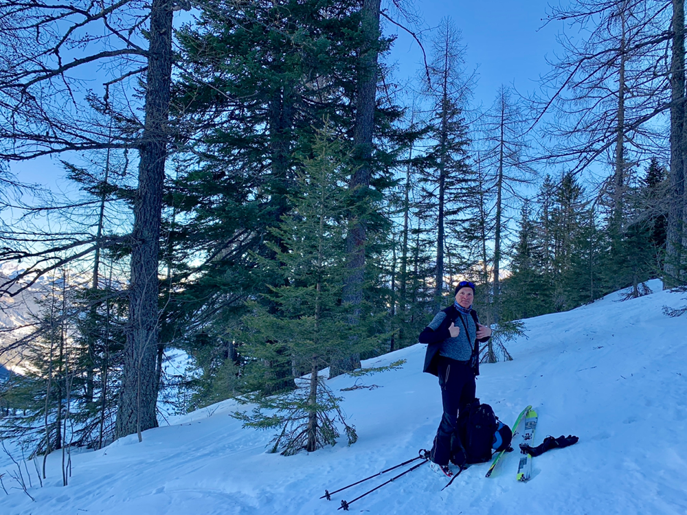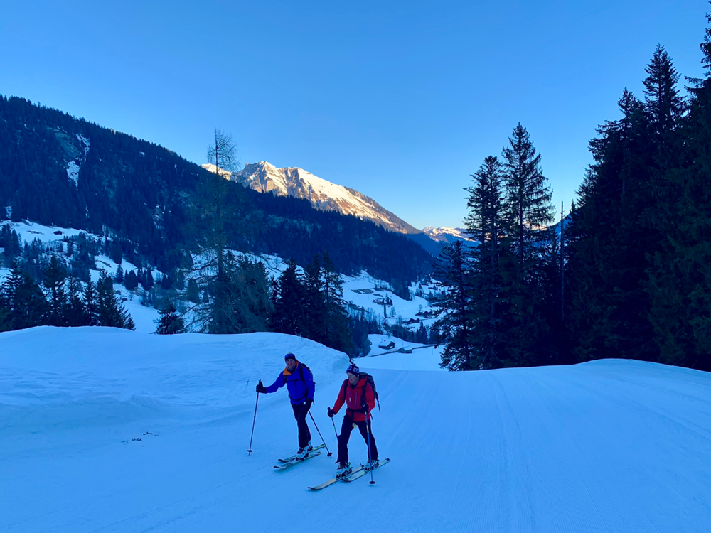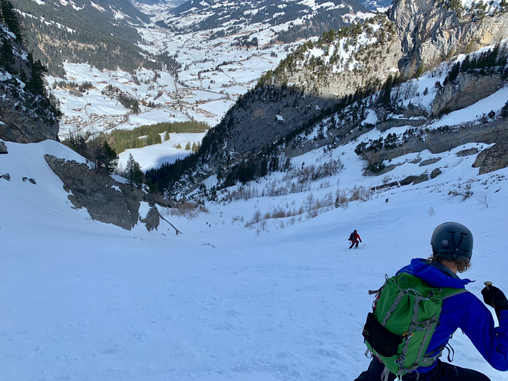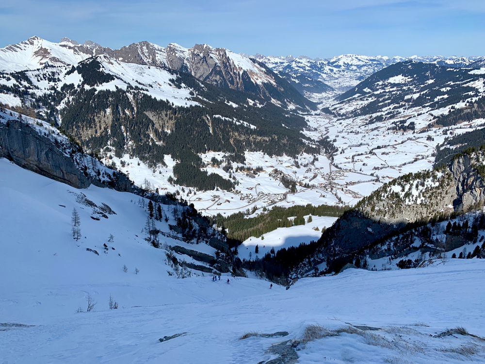 Zum ewigen Verweilen war es dann aber zu zügig da oben und so machten wir uns nach dem Gipfelselfie und Rolis Werbeaufnahmen für einen Schweizer Skihersteller auf in die Abfahrt. Diese war oben im stark windgepressten Gipfelhang nicht soo der Hit aber je weiter wir die Hochebene herunter kurvten, umso besser wurde der Schnee. Dann liess Roli nach einer Traverse plötzlich scharf links abbiegen und schon ging es wieder kurz hoch in einen Sattel. Diese paar Meter bewältigten wir zu Fuss mit geschulterten Skiern und dann begann Rolis Geheimtipp. Anstatt den mühsamen Abstieg, wo wir hochgekommen waren, durch den Wald und die Tragestelle, kurvten wir ein schmales steiles Tal hinab. Dazu teilten wir und in zwei Gruppen auf und fuhren einzeln die steilsten Passagen herunter. Gute, grad so wirklich der Geheimtipp ist diese Route dann wohl doch nicht. Hatten sich doch schon einige Tourengeher vor uns dieses Abfahrt genehmigt. Entsprechend war auch der Schnee dort eher fordernd als ein Genuss. Aber die Variante machte dennoch sehr viel Spass. Ausgespuckt aus dem steilen Tal wurden wir dann exakt oben am eisigen Weglein durch den Wald. Zu früh gefreut, wer gedacht hatte, dieses könnten wir auch noch gleich umgehen. Also mogelten wir uns halt auch da noch irgendwie runter und eine Heitilift Skipiste später standen wir auch wieder bei unseren Autos. Ins Kafi ging's dann auch gleich noch Vorort wo wir auf Holzstühlen, die mehr an einen Thron erinnerten, die Sonne genossen und angeregte Gespräche führten. Herzlichen Dank an Roli für die tolle Tour! Das war echt cool...