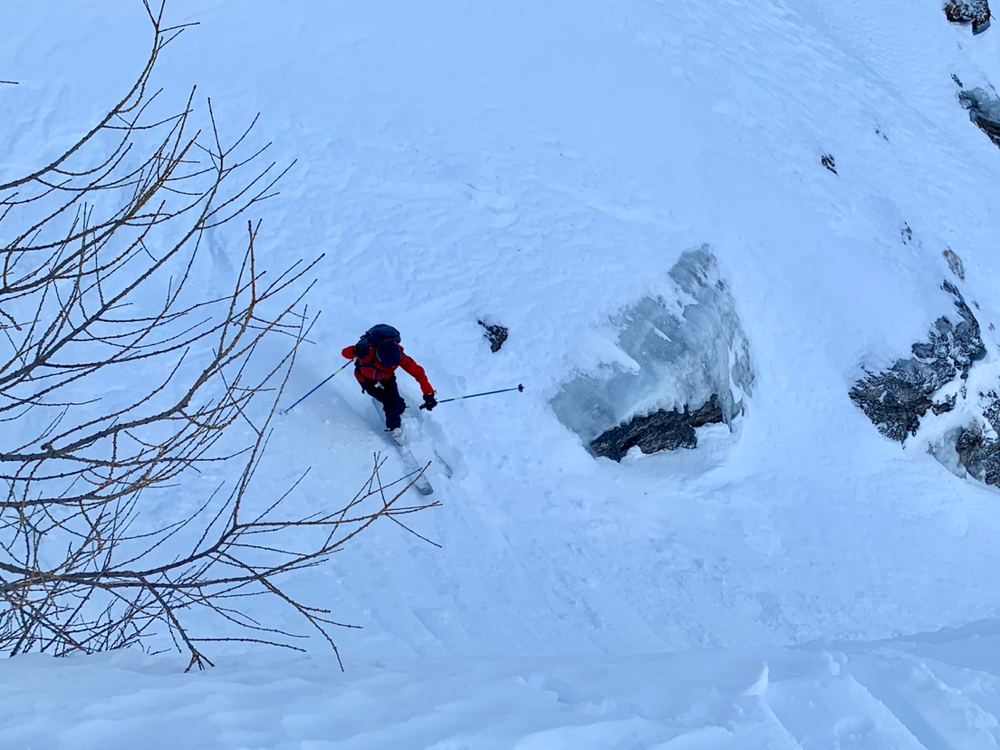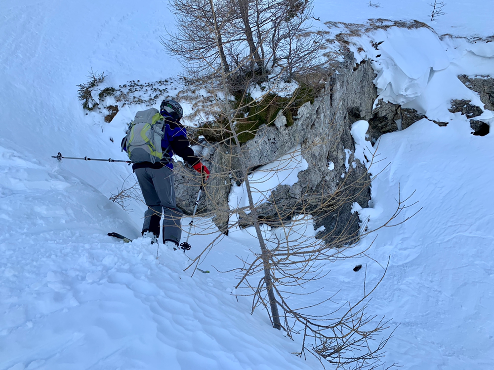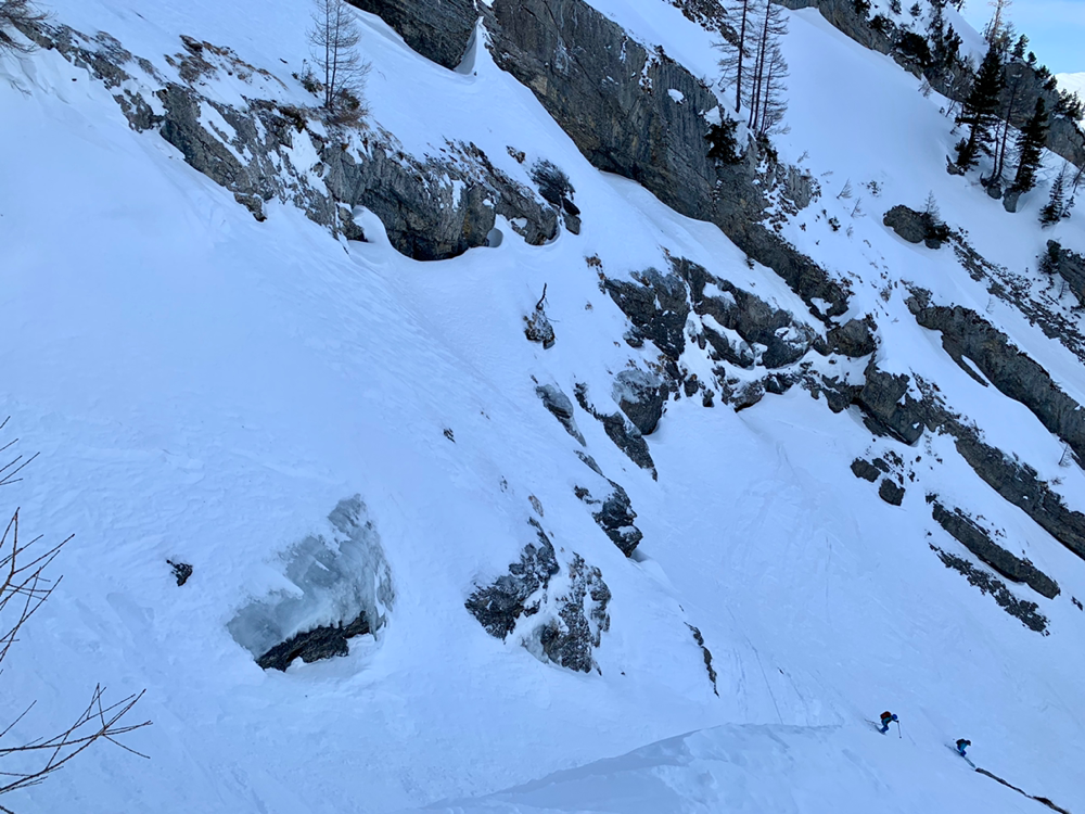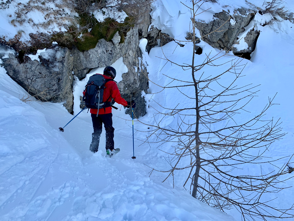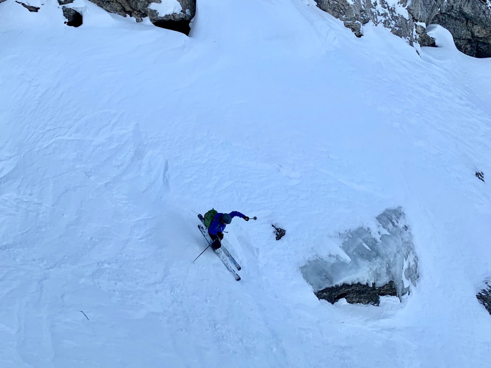 Zum ewigen Verweilen war es dann aber zu zügig da oben und so machten wir uns nach dem Gipfelselfie und Rolis Werbeaufnahmen für einen Schweizer Skihersteller auf in die Abfahrt. Diese war oben im stark windgepressten Gipfelhang nicht soo der Hit aber je weiter wir die Hochebene herunter kurvten, umso besser wurde der Schnee. Dann liess Roli nach einer Traverse plötzlich scharf links abbiegen und schon ging es wieder kurz hoch in einen Sattel. Diese paar Meter bewältigten wir zu Fuss mit geschulterten Skiern und dann begann Rolis Geheimtipp. Anstatt den mühsamen Abstieg, wo wir hochgekommen waren, durch den Wald und die Tragestelle, kurvten wir ein schmales steiles Tal hinab. Dazu teilten wir und in zwei Gruppen auf und fuhren einzeln die steilsten Passagen herunter. Gute, grad so wirklich der Geheimtipp ist diese Route dann wohl doch nicht. Hatten sich doch schon einige Tourengeher vor uns dieses Abfahrt genehmigt. Entsprechend war auch der Schnee dort eher fordernd als ein Genuss. Aber die Variante machte dennoch sehr viel Spass. Ausgespuckt aus dem steilen Tal wurden wir dann exakt oben am eisigen Weglein durch den Wald. Zu früh gefreut, wer gedacht hatte, dieses könnten wir auch noch gleich umgehen. Also mogelten wir uns halt auch da noch irgendwie runter und eine Heitilift Skipiste später standen wir auch wieder bei unseren Autos. Ins Kafi ging's dann auch gleich noch Vorort wo wir auf Holzstühlen, die mehr an einen Thron erinnerten, die Sonne genossen und angeregte Gespräche führten. Herzlichen Dank an Roli für die tolle Tour! Das war echt cool...