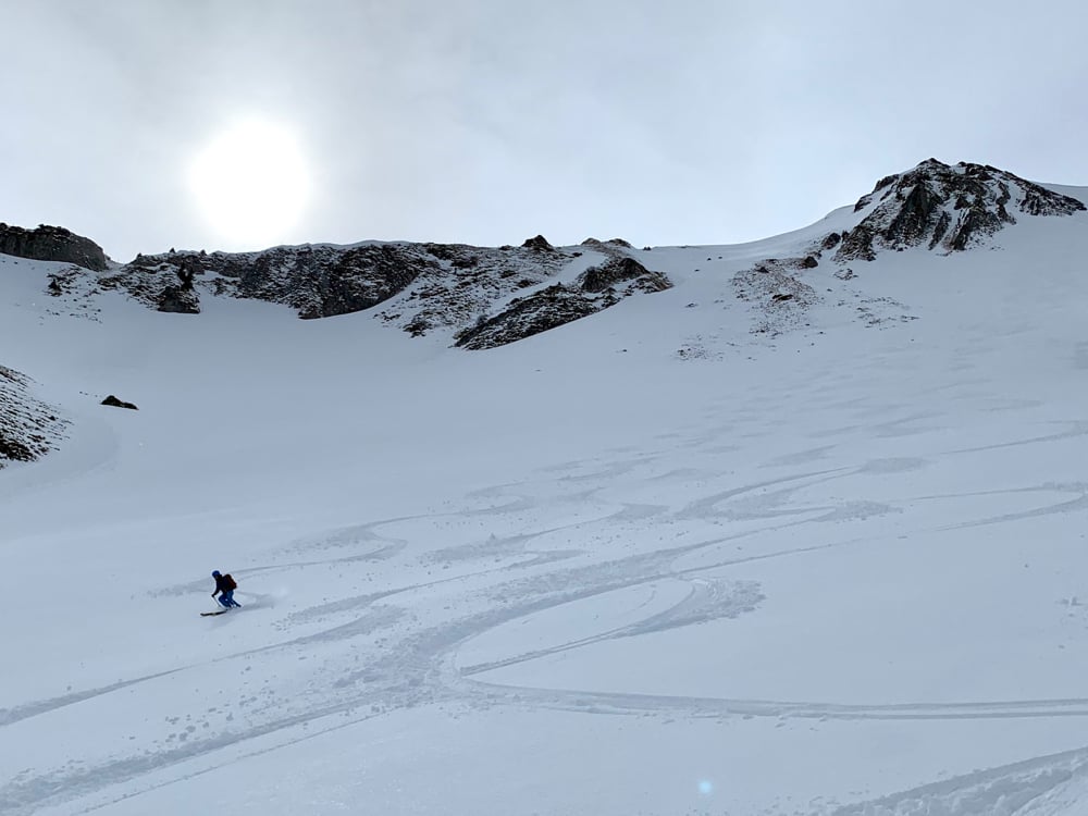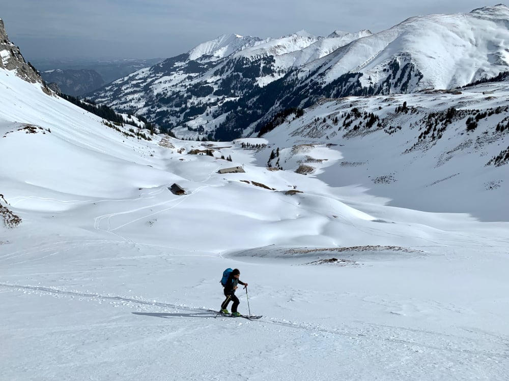Nach einer kurzen Teepause wurde In zügigen Schritten der Gipfelaufstieg unter die Latten genommen. Zwischen den abgewindeten Rücken hatte es schöne Bänder, gefüllt mit Schnee, welche doch eine spassige Abfahrt erahnen liess. Sobald jedoch die Gruppe den Grat erreichte, setzte auch gleich der stramme Wind ein. So waren die Felle bald verstaut und die Schuhe mehr oder weniger auf Skifahren umgestellt. Die Abfahrt war dann doch ganz ordentlich bis sehr brav, um es mal bescheiden auszudrücken. Im Gurbs Metenberg besammelte sich die Gruppe nochmals zu Schnaps, „Gipfelselvie“ und Stärkung für die restliche Abfahrt. Diese zeigte sich durch die grosse wärme zunehmend durchnässt. Mit ordentlich Schwung konnte jedoch auch der Ramsli-hang noch brav durchgepflügt werden. Der Rest war dann noch eine Pflichtübung und ein mässiger Genuss.