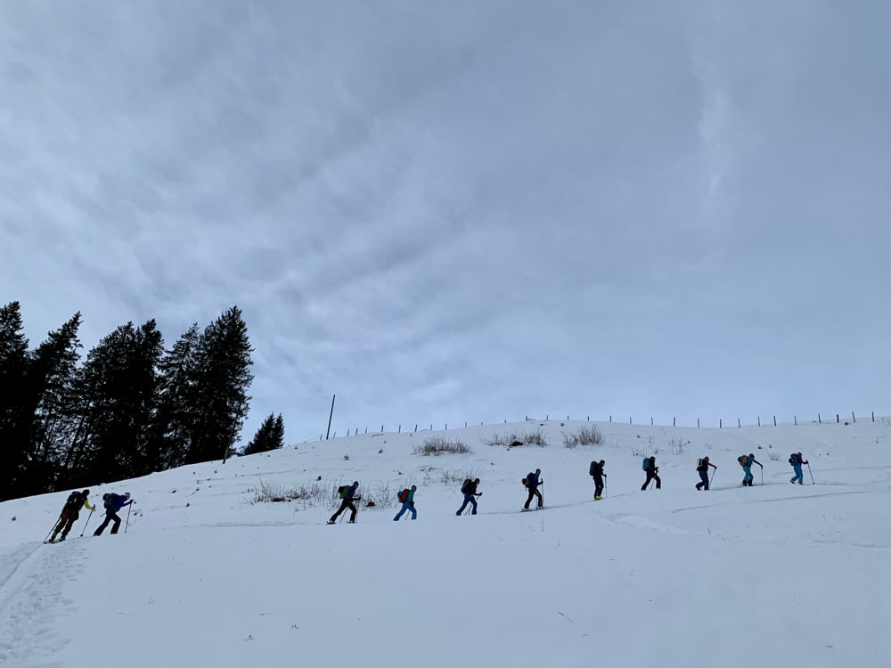 Im Verlaufe des Vorabends kamen dann auch noch die letzten Anmeldungen eingetrudelt und so begaben sich doch zwölf Türelerinnen und Türeler in Richtung Säge. Kurz vor dem Parkplatz trafen sie endlich auf Schnee wobei dessen Konsistenz, den Gesichtern an, nicht wirklich zu gefallen schien. Mir wars‘s egal...