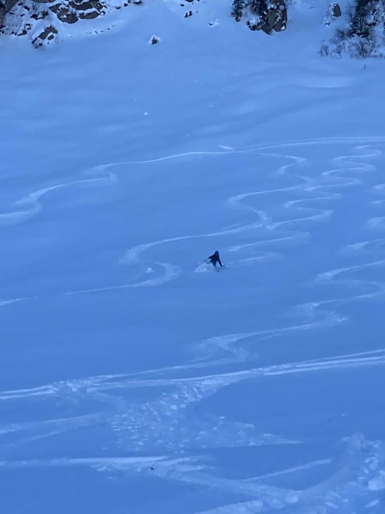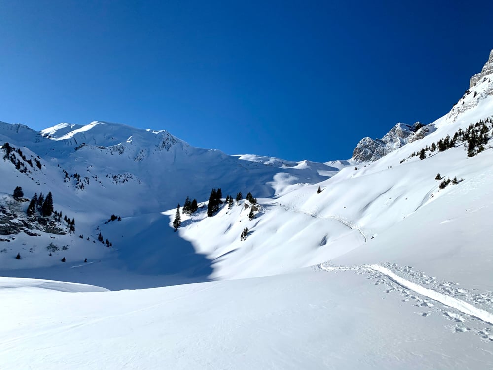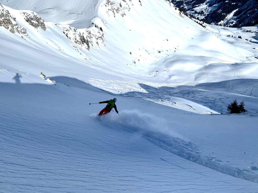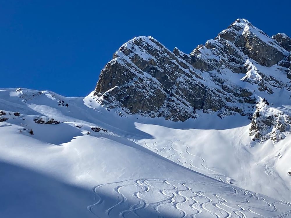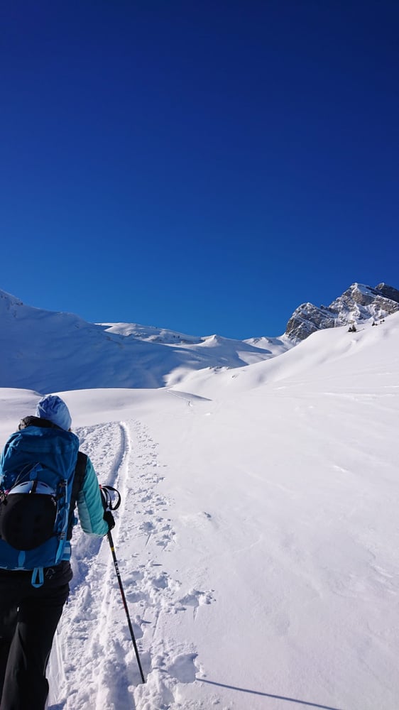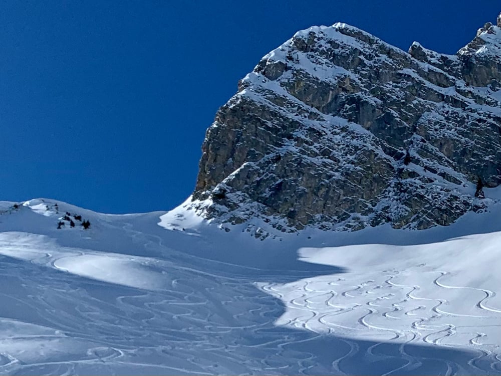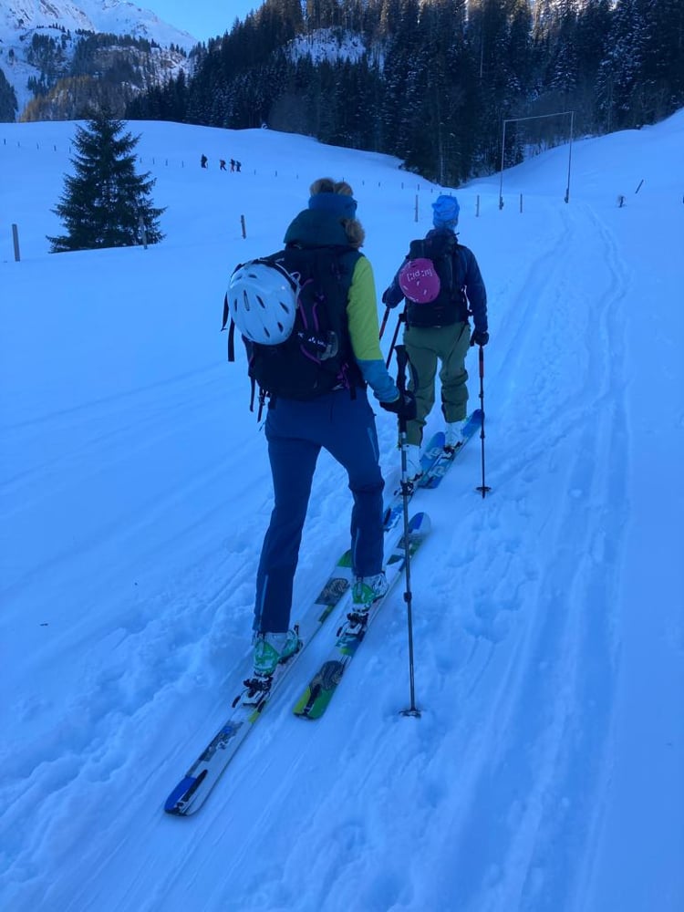 Bei winterlichen Verhältnissen marschierten 15 gut gelaunte Türeler in den 5-er Gruppen los. Mat mit der "Elite Truppe", Kusi mit den "Erfahrenen und Besonnenen" und Nicole mit der "Genussgruppe". Der Schnee sah vielversprechend aus, federleicht und die gestrigen Spuren waren tatsächlich verdeckt. Wahrscheinlich mehr Triebschnee als Neuschnee, für den Fahrspass erwies sich dies zum Glück als unbedeutend.