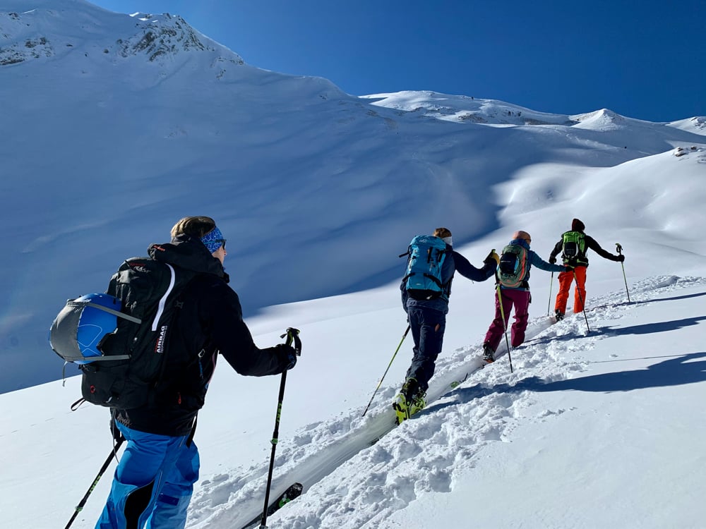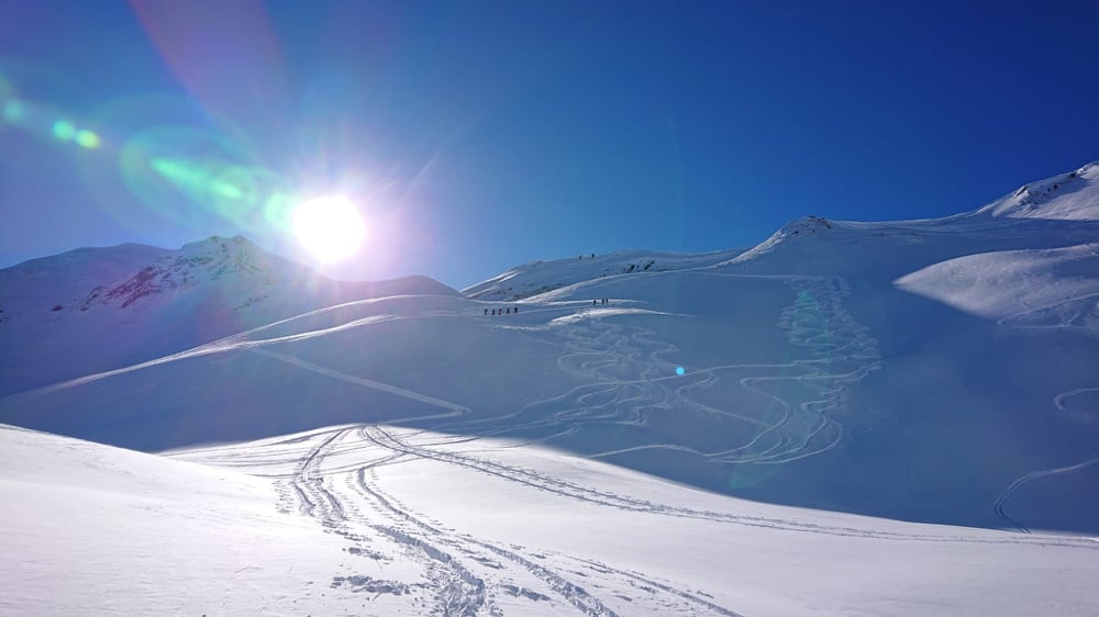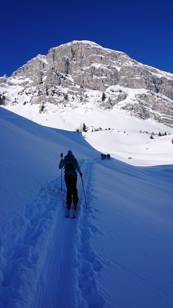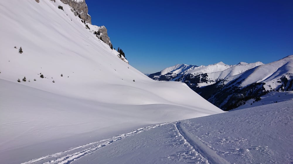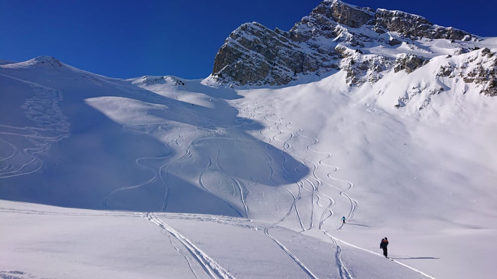 Der strahlend blaue Himmel, die zauberhafte Landschaft beim Aufstieg motivierten. Zwar dachte ich mir, als ich den "Stau" bei den Schlüsselstellen sah, "eine halbe Stunde eher wäre taktisch nicht unklug gewesen." Angekommen auf dem Gurbssattel zeigte sich die Sorge als unbegründet. Einzig Mat's Elite Truppe, Kusis Erfahrene und Besonnene und einige wenige andere lockte die Abfahrt. Einige trugen die Skis lieber wieder halb runter während andere sich die Aussicht nicht entgehen lassen wollten und daher den schneearmen Grat hoch marschierten. So fand auch unsere Genusstourengruppe noch genügend Platz für eigene schöne Spuren.