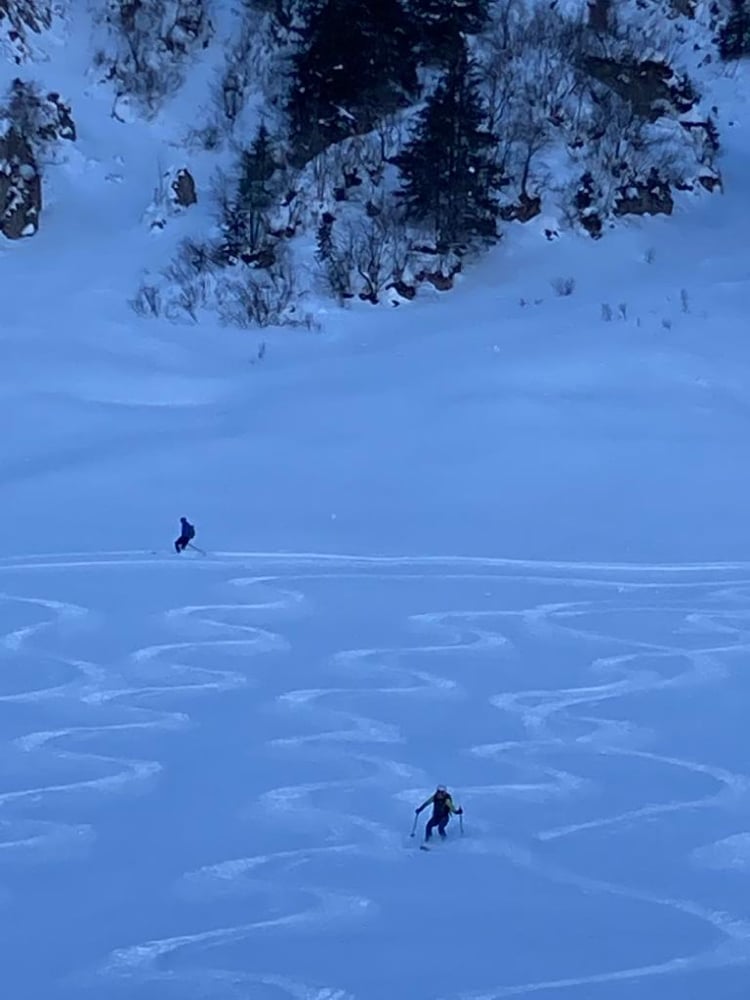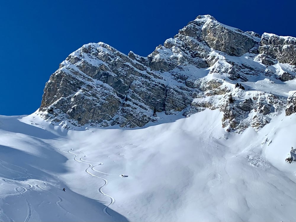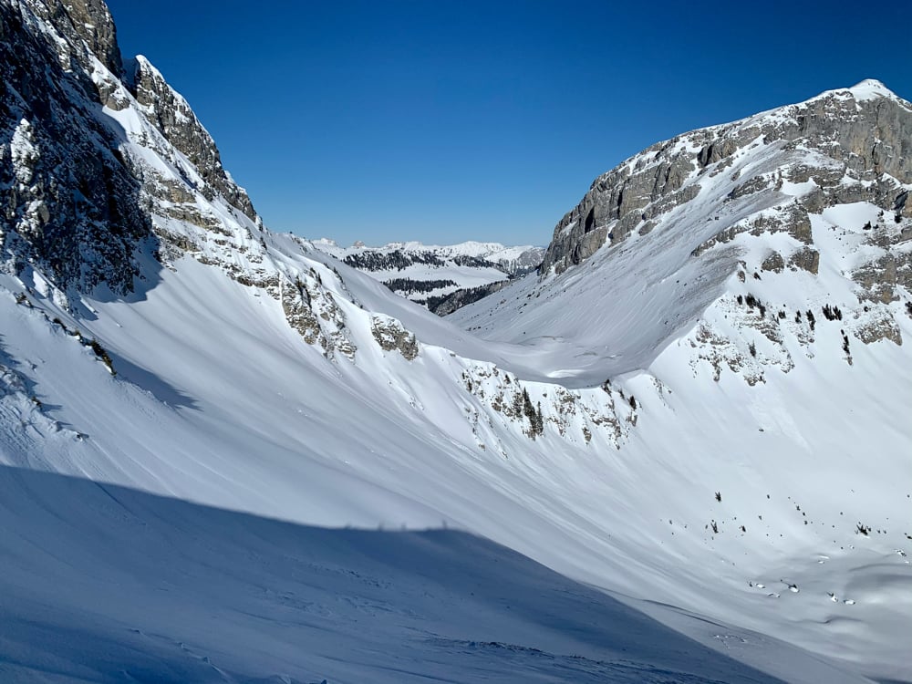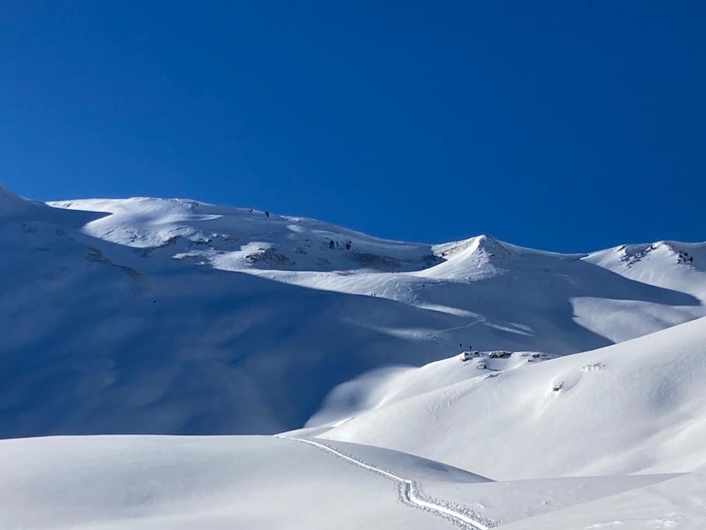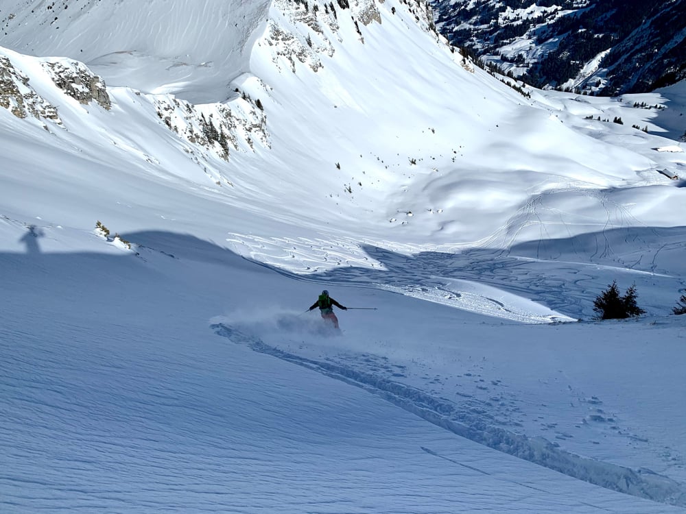 Der strahlend blaue Himmel, die zauberhafte Landschaft beim Aufstieg motivierten. Zwar dachte ich mir, als ich den "Stau" bei den Schlüsselstellen sah, "eine halbe Stunde eher wäre taktisch nicht unklug gewesen." Angekommen auf dem Gurbssattel zeigte sich die Sorge als unbegründet. Einzig Mat's Elite Truppe, Kusis Erfahrene und Besonnene und einige wenige andere lockte die Abfahrt. Einige trugen die Skis lieber wieder halb runter während andere sich die Aussicht nicht entgehen lassen wollten und daher den schneearmen Grat hoch marschierten. So fand auch unsere Genusstourengruppe noch genügend Platz für eigene schöne Spuren.