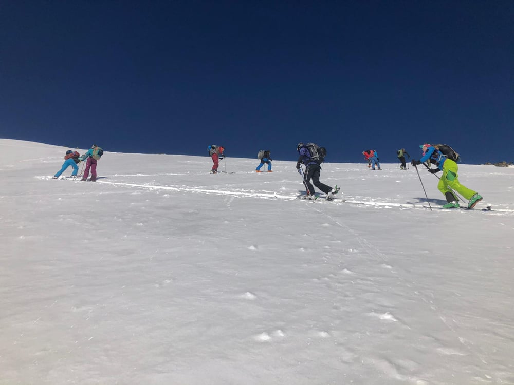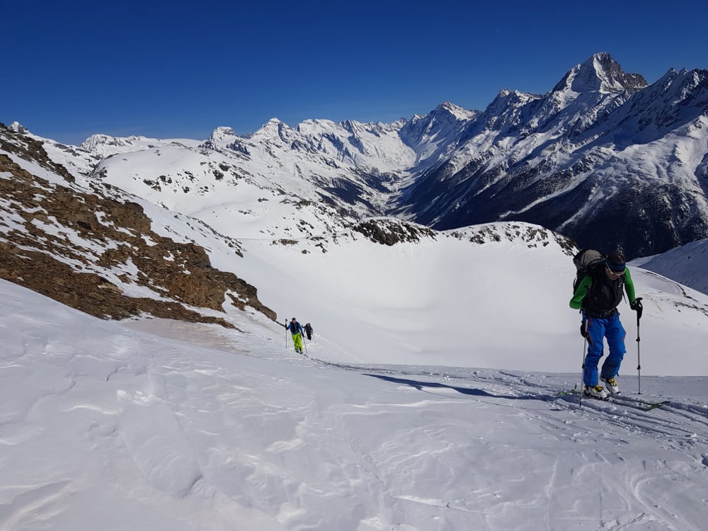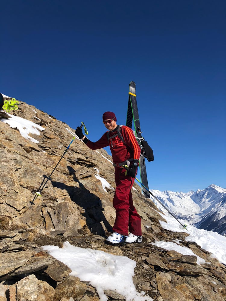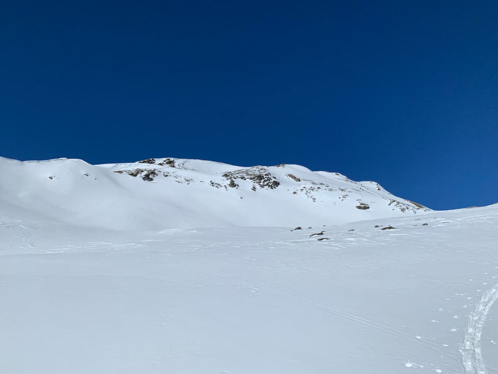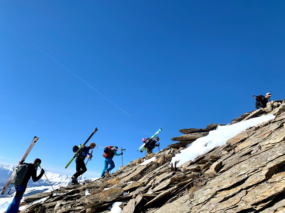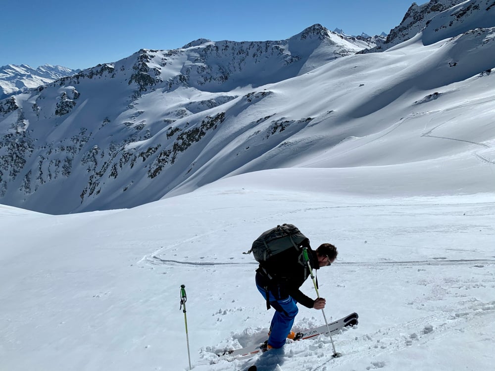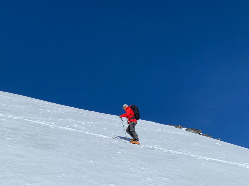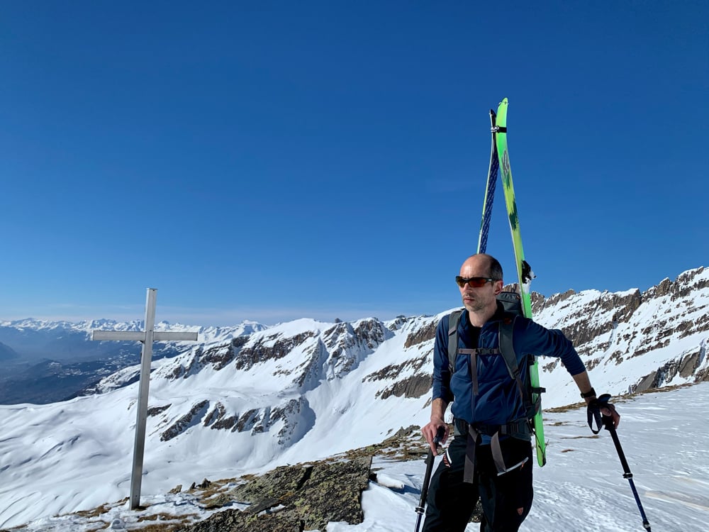 Wer nun gedacht hätte, dass ab hier ja das fiese Eis und die Schneechruglen des Verderbens hinter uns lägen und nun nicht mehr viel schief gehen könne, hatte die Rechnung ohne die Sonne gemacht. Sie schickte uns nun nämlich neben den warmen Strahlen auch Mörder-Stogle! Theiss sein Ski hob bei jedem Schritt derart grosse Gräben aus, dass wir hintendran schon von Kartoffeln pflanzen sprachen. Jeder Schritt wurde nun schwer und wollte doppelt verdient sein. Natürlich führte uns Roli gewohnt routiniert auch durch diese Unwegsamkeit und versprach uns zur Motivation baldige Blicke auf irgend ein Gipfelkreuz, welche sich im nachhinein betrachtet dann doch noch ein ganz schönen Stück hinzogen. Aber Motivation ist eben alles und so standen wir dann doch irgendwann nur noch wenig unterhalb des Gipfels, von wo die Skier schliesslich noch getragen werden wollten. Da unsere Tour quasi eine Überschreitung war, mussten die Skier eben mit hoch um auf der anderen Seite abzufahren.