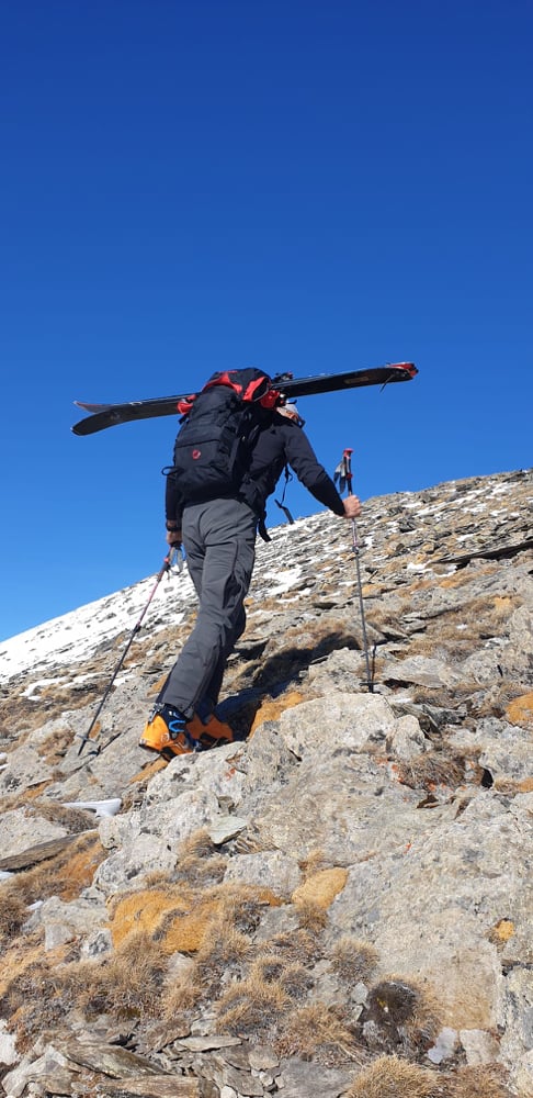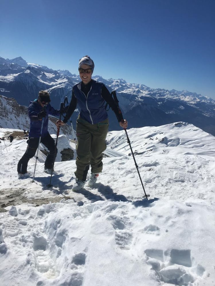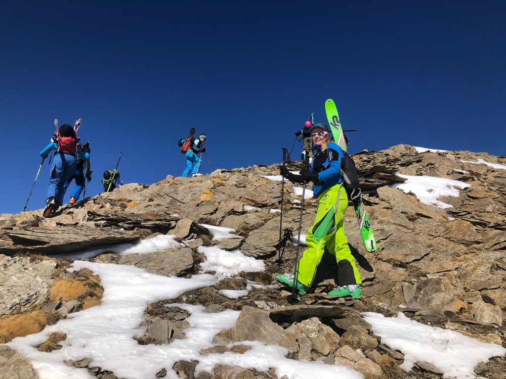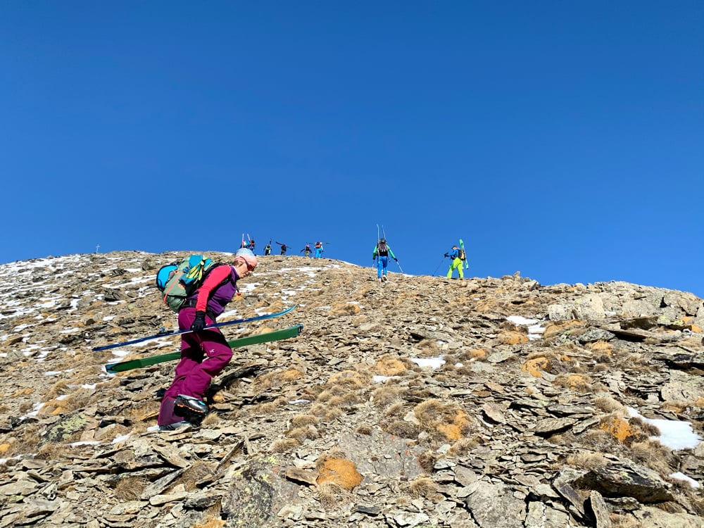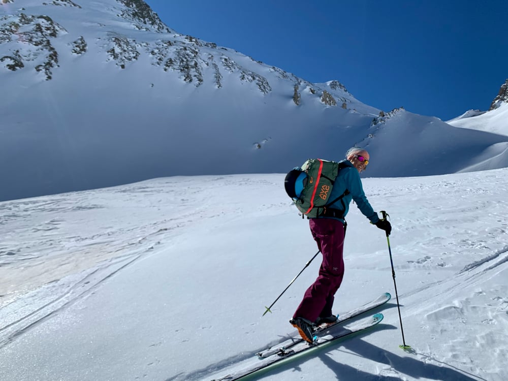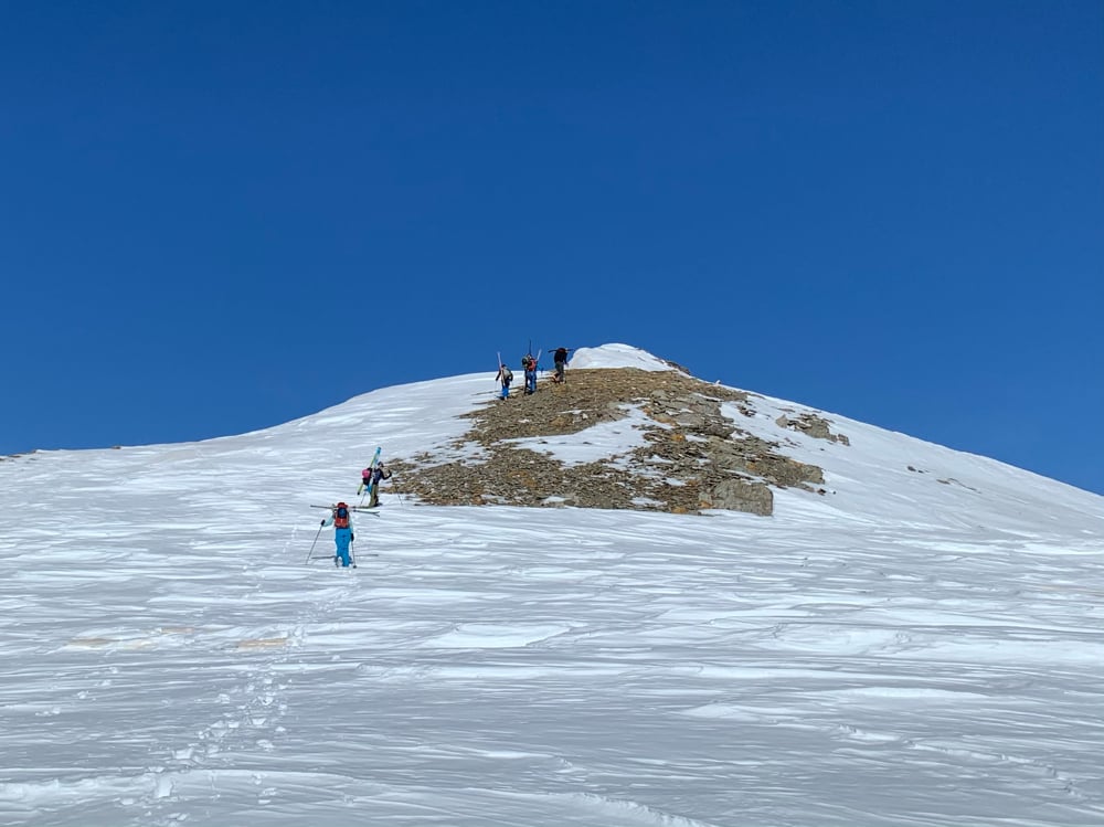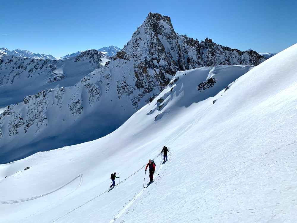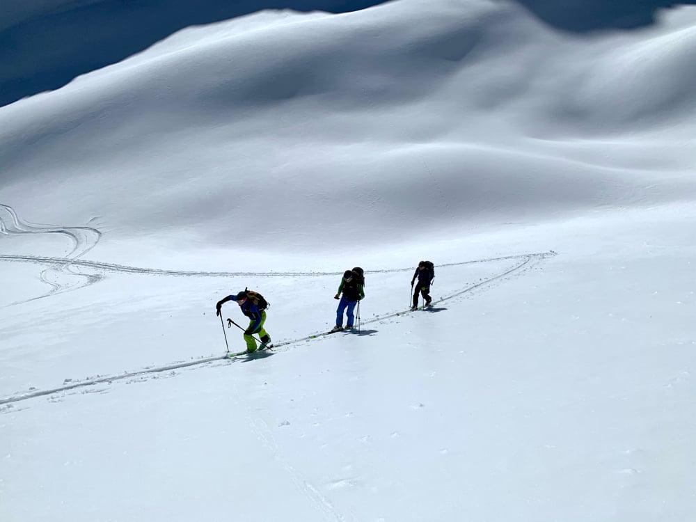 Wer nun gedacht hätte, dass ab hier ja das fiese Eis und die Schneechruglen des Verderbens hinter uns lägen und nun nicht mehr viel schief gehen könne, hatte die Rechnung ohne die Sonne gemacht. Sie schickte uns nun nämlich neben den warmen Strahlen auch Mörder-Stogle! Theiss sein Ski hob bei jedem Schritt derart grosse Gräben aus, dass wir hintendran schon von Kartoffeln pflanzen sprachen. Jeder Schritt wurde nun schwer und wollte doppelt verdient sein. Natürlich führte uns Roli gewohnt routiniert auch durch diese Unwegsamkeit und versprach uns zur Motivation baldige Blicke auf irgend ein Gipfelkreuz, welche sich im nachhinein betrachtet dann doch noch ein ganz schönen Stück hinzogen. Aber Motivation ist eben alles und so standen wir dann doch irgendwann nur noch wenig unterhalb des Gipfels, von wo die Skier schliesslich noch getragen werden wollten. Da unsere Tour quasi eine Überschreitung war, mussten die Skier eben mit hoch um auf der anderen Seite abzufahren.