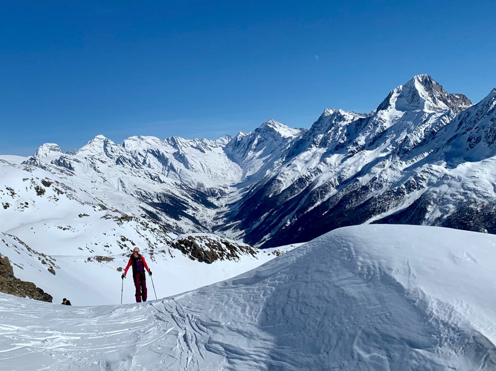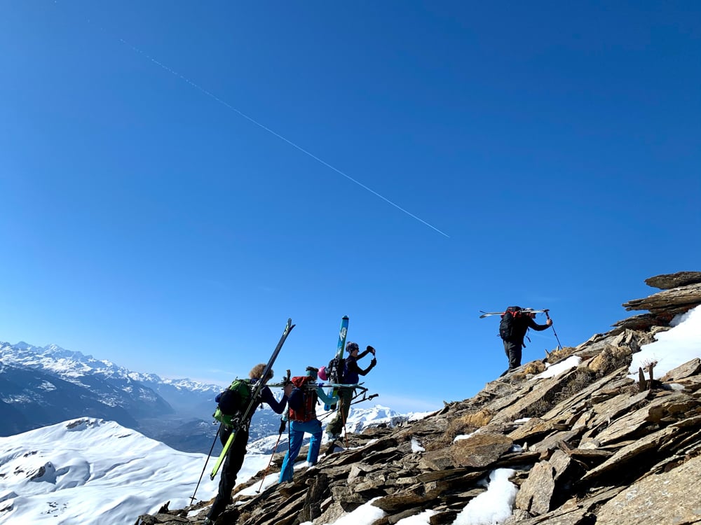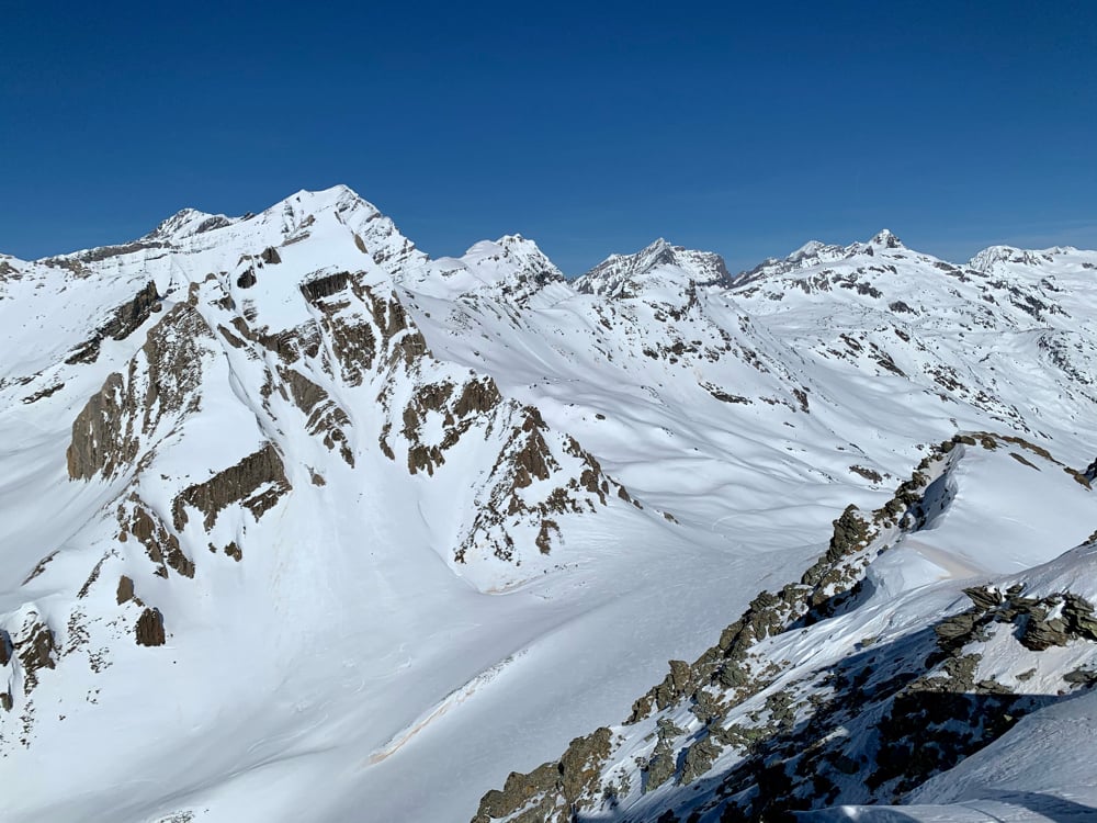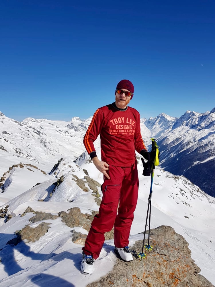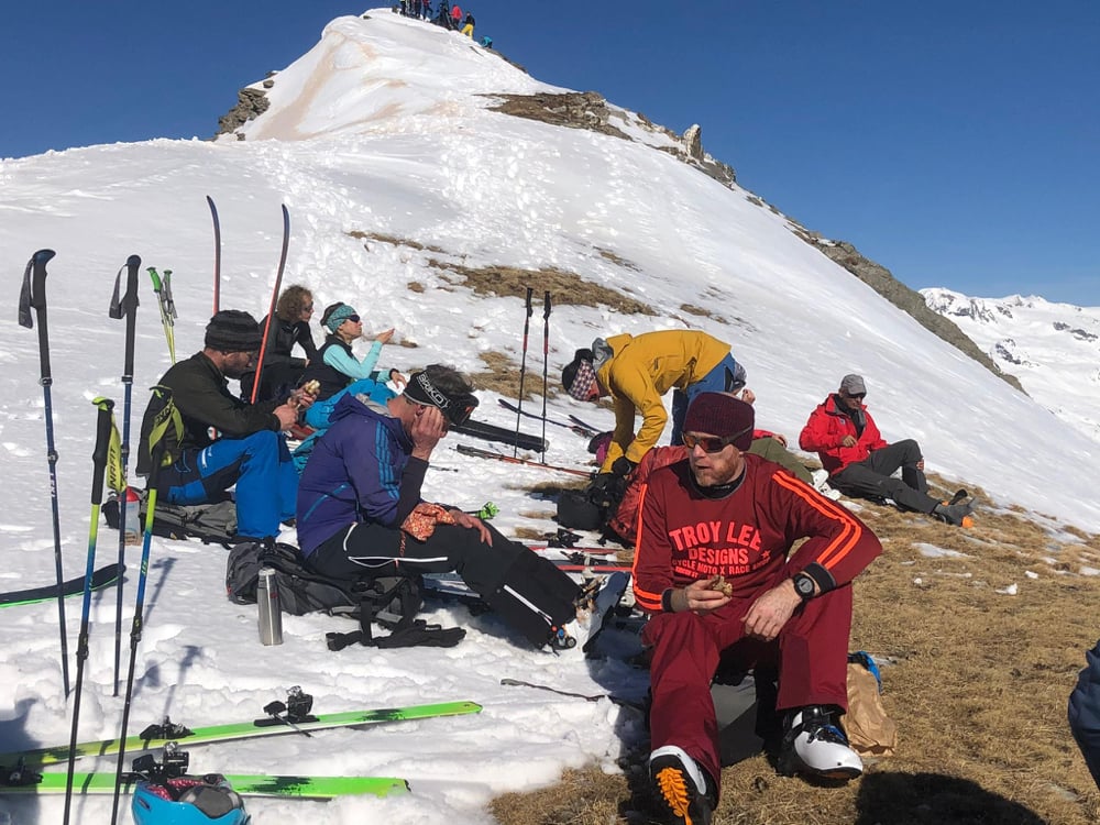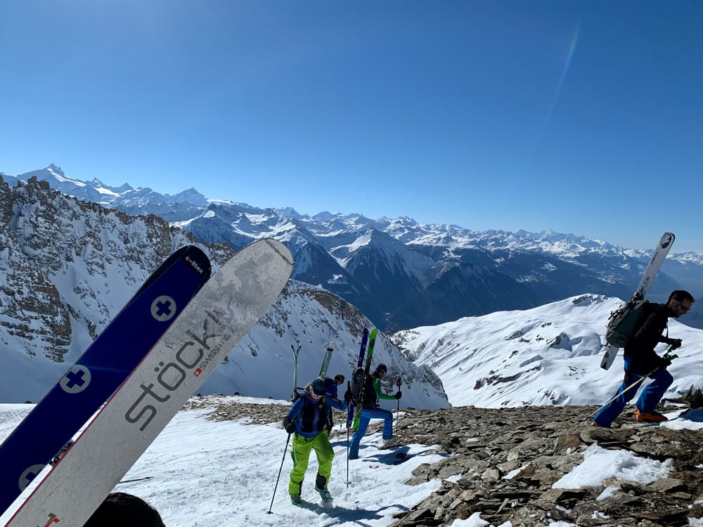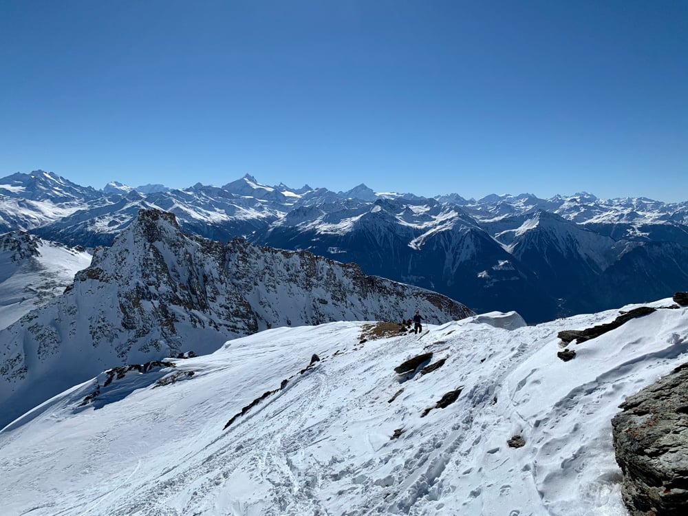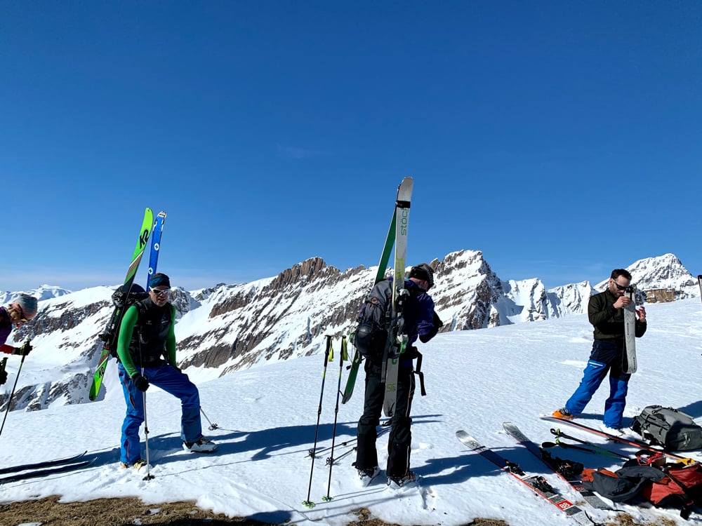 Der Ausblick von der Loicherspitze, kurze Zeit später, war dann wirklich wunderschön. Wir genossen bei absoluter windstille das schöne Panorama und mampften allerhand leckere Sachen um unsere Energiereserven wieder aufzufüllen. Es hatte ja nicht jeder bereits im Aufstieg emsig an Energy-Gels genuckelt, gell Roli! Auch auf dem Gipfel war nicht die Zeit für eine ausgiebige Pause, denn der Schnee war wirklich bereits recht weich und die Temperaturen auch auf fast 3000m erstaunlich hoch. Also nichts wie los in die Abfahrt! Es folgte ein erster toller Hang mit anschliessendem Wiederanstieg in den Sattel der Tellifurgga. Schnell waren die Felle montiert und oben gleich wieder entfernt, um sich erneut hinab zu stürzen. Diesmal dauerte die Abfahrt deutlich länger und der Schnee war, entgegen Roli's Warnungen von der Rekotour, wirklich toll zu fahren. Alle genossen die schönen Schwünge hinunter zur Restialp. Ab da wurde es dann doch sehr weich und der Schnee wollte den Skiern nicht mehr so recht Gegenhalt verleihen. Es ging zunehmend in Richtung surfen. Zum Glück erreichten wir kurz darauf das Strässchen, welches uns wohlbehalten zurück nach Ferden brachte. Der Autor dieses Textes brachte es sogar da noch fertig ein Stürzchen zu fabrizieren. Das muss man erstmal schaffen...