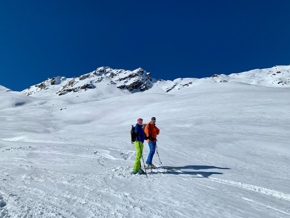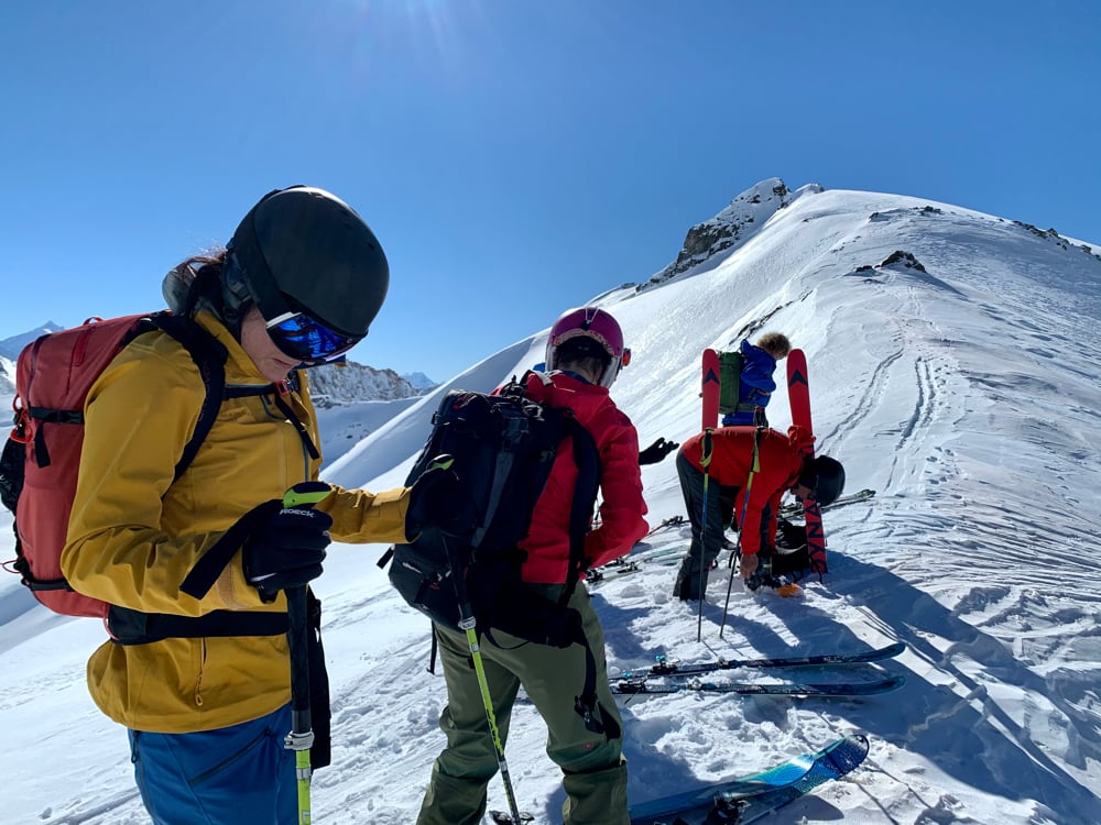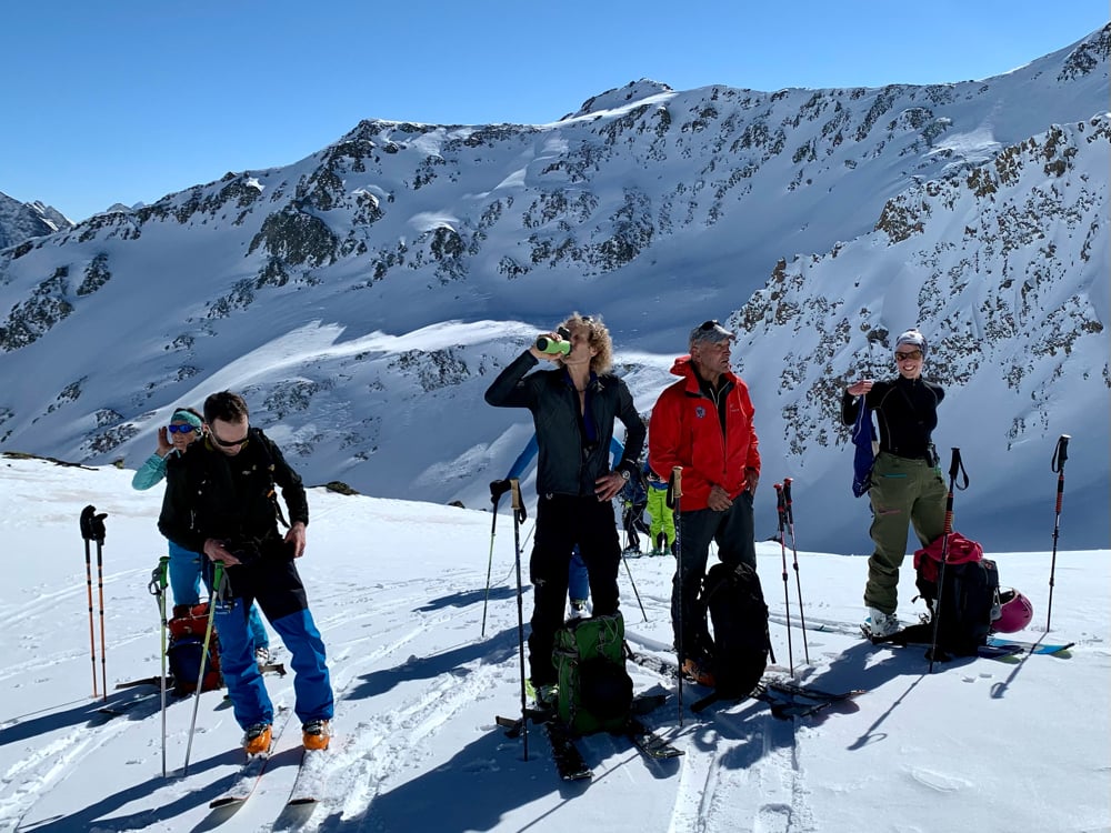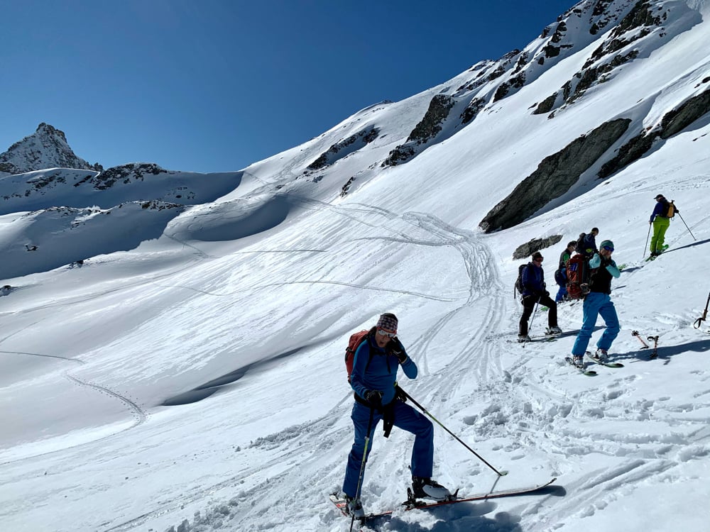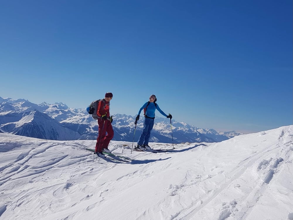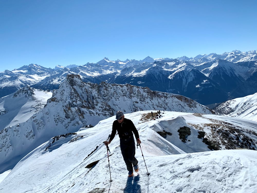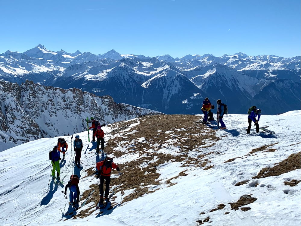 Der Ausblick von der Loicherspitze, kurze Zeit später, war dann wirklich wunderschön. Wir genossen bei absoluter windstille das schöne Panorama und mampften allerhand leckere Sachen um unsere Energiereserven wieder aufzufüllen. Es hatte ja nicht jeder bereits im Aufstieg emsig an Energy-Gels genuckelt, gell Roli! Auch auf dem Gipfel war nicht die Zeit für eine ausgiebige Pause, denn der Schnee war wirklich bereits recht weich und die Temperaturen auch auf fast 3000m erstaunlich hoch. Also nichts wie los in die Abfahrt! Es folgte ein erster toller Hang mit anschliessendem Wiederanstieg in den Sattel der Tellifurgga. Schnell waren die Felle montiert und oben gleich wieder entfernt, um sich erneut hinab zu stürzen. Diesmal dauerte die Abfahrt deutlich länger und der Schnee war, entgegen Roli's Warnungen von der Rekotour, wirklich toll zu fahren. Alle genossen die schönen Schwünge hinunter zur Restialp. Ab da wurde es dann doch sehr weich und der Schnee wollte den Skiern nicht mehr so recht Gegenhalt verleihen. Es ging zunehmend in Richtung surfen. Zum Glück erreichten wir kurz darauf das Strässchen, welches uns wohlbehalten zurück nach Ferden brachte. Der Autor dieses Textes brachte es sogar da noch fertig ein Stürzchen zu fabrizieren. Das muss man erstmal schaffen...