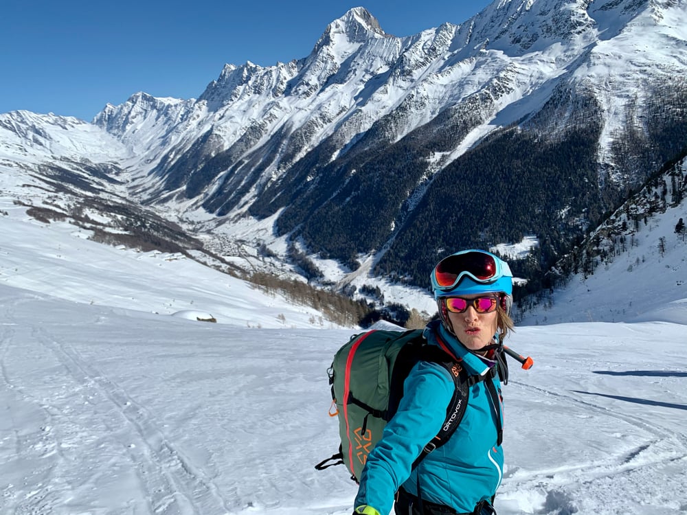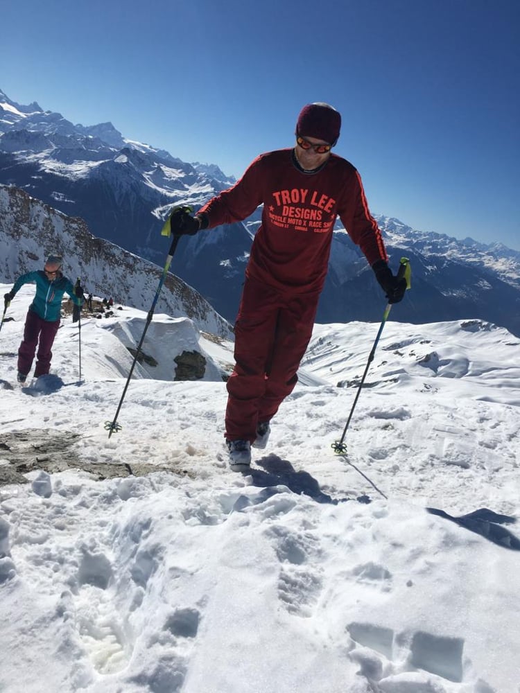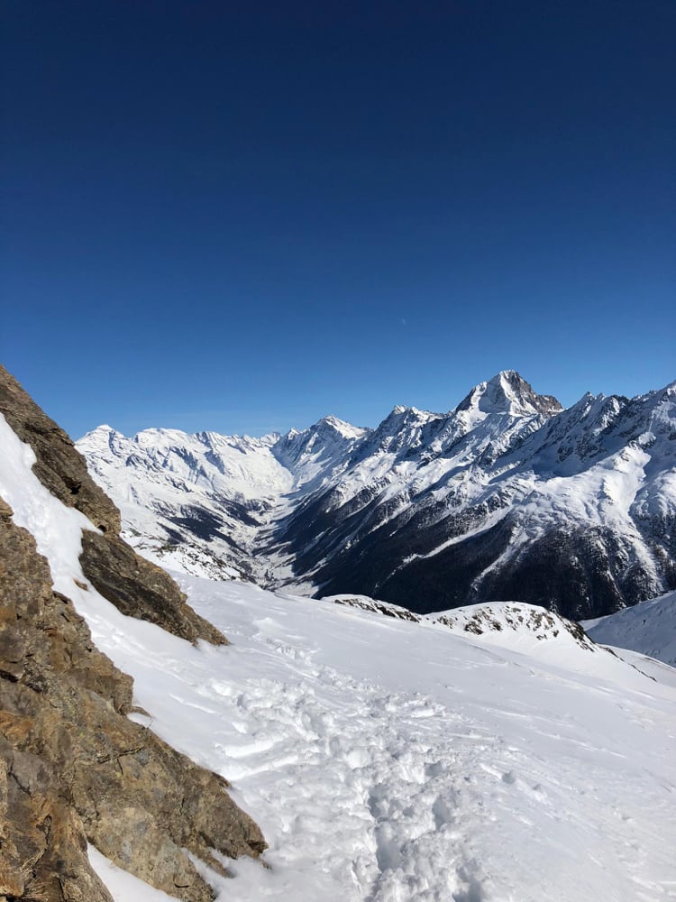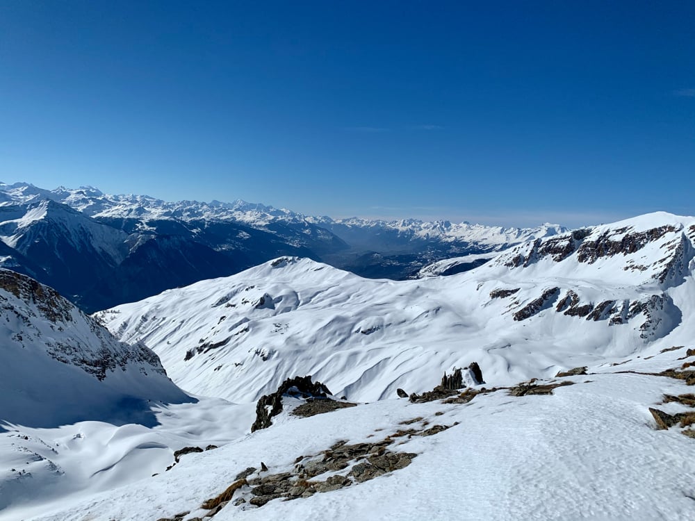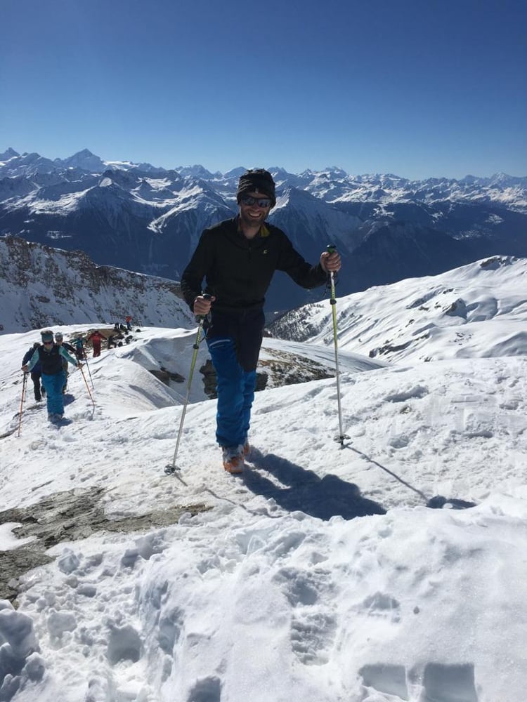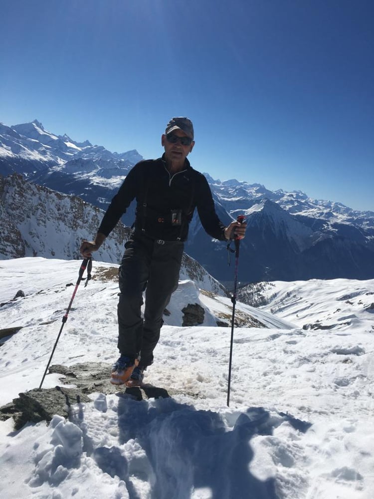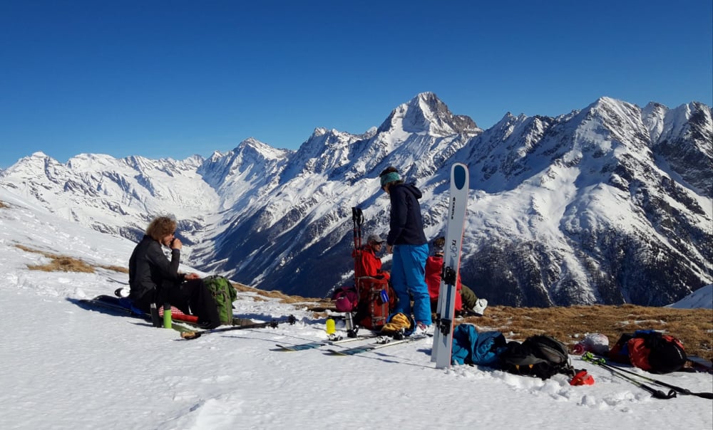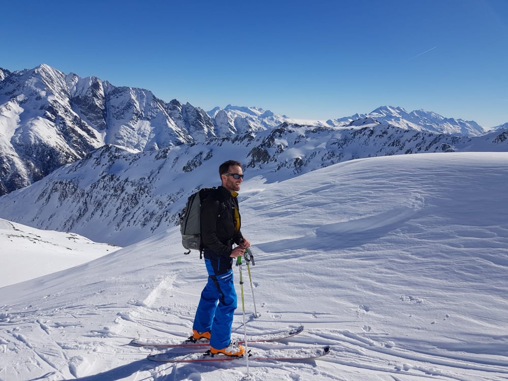 Der Ausblick von der Loicherspitze, kurze Zeit später, war dann wirklich wunderschön. Wir genossen bei absoluter windstille das schöne Panorama und mampften allerhand leckere Sachen um unsere Energiereserven wieder aufzufüllen. Es hatte ja nicht jeder bereits im Aufstieg emsig an Energy-Gels genuckelt, gell Roli! Auch auf dem Gipfel war nicht die Zeit für eine ausgiebige Pause, denn der Schnee war wirklich bereits recht weich und die Temperaturen auch auf fast 3000m erstaunlich hoch. Also nichts wie los in die Abfahrt! Es folgte ein erster toller Hang mit anschliessendem Wiederanstieg in den Sattel der Tellifurgga. Schnell waren die Felle montiert und oben gleich wieder entfernt, um sich erneut hinab zu stürzen. Diesmal dauerte die Abfahrt deutlich länger und der Schnee war, entgegen Roli's Warnungen von der Rekotour, wirklich toll zu fahren. Alle genossen die schönen Schwünge hinunter zur Restialp. Ab da wurde es dann doch sehr weich und der Schnee wollte den Skiern nicht mehr so recht Gegenhalt verleihen. Es ging zunehmend in Richtung surfen. Zum Glück erreichten wir kurz darauf das Strässchen, welches uns wohlbehalten zurück nach Ferden brachte. Der Autor dieses Textes brachte es sogar da noch fertig ein Stürzchen zu fabrizieren. Das muss man erstmal schaffen...