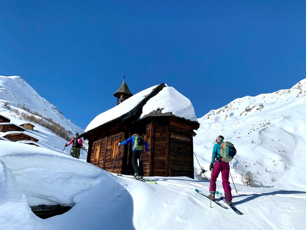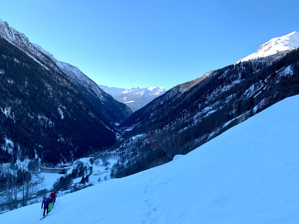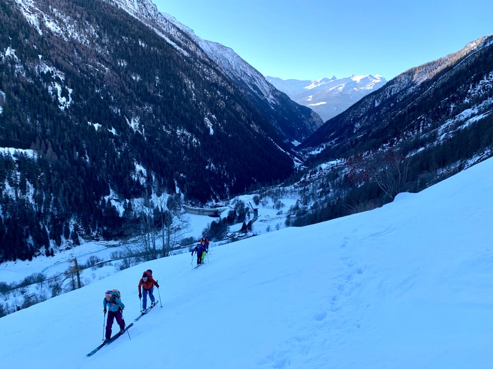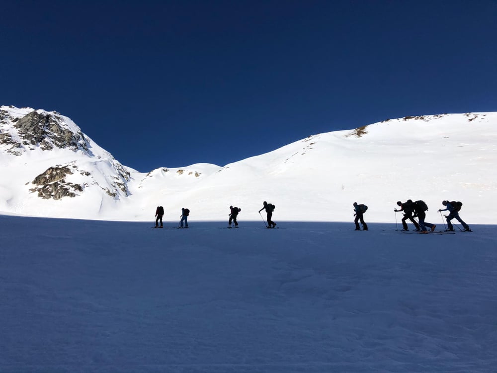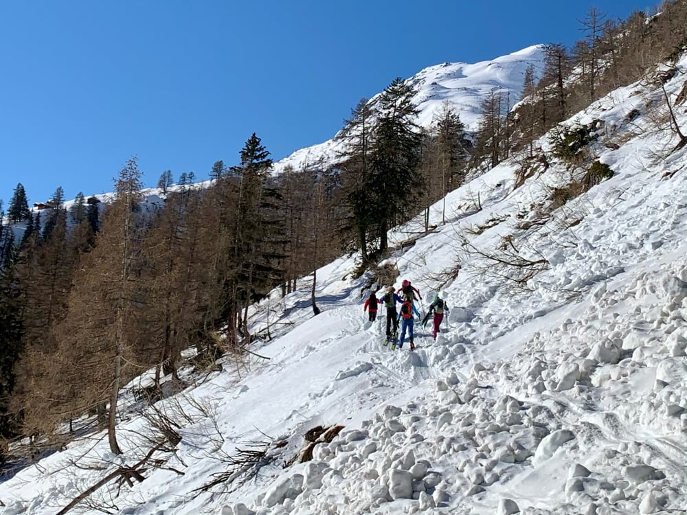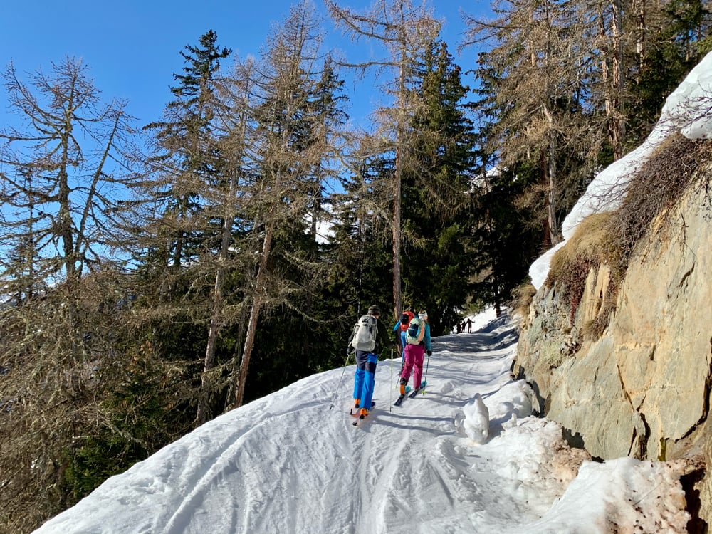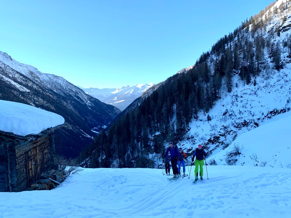 Nachdem uns die rappelvollen ÖV in Ferden ausgespuckt hatten, bekamen unsere Skier, nach kurzem Fussmarsch, endlich Schnee zu spüren. Ein paar Minuten später spürten sie allerdings auch bereits die Harscheisen! Damit schafften wir die delikat gefrorenen Hänge hoch nach Bärsol, wo wir wieder die Strasse erreichten, zwar nicht locker, aber etwas entspannter. Weiter ging es eben auf besagter Strasse. Bevor wir jedoch die wunderschöne Faldumalp erreichten, mussten noch einigen Nassschneelawinen überquert werden. Immerhin begrüsste uns da auch bereits die Sonne, welche den Schnee etwas antaute und half, die Unebenheiten in den Lawinen besser umzirkeln zu können. Trotzdem kämpften einige Teilnehmer heroische Kämpfe mit den "Schneechrugle", welche sich ihnen in den Weg stellten und liessen dabei einige Federn.