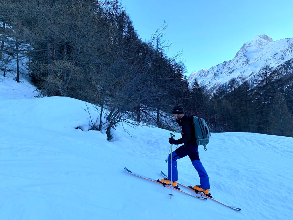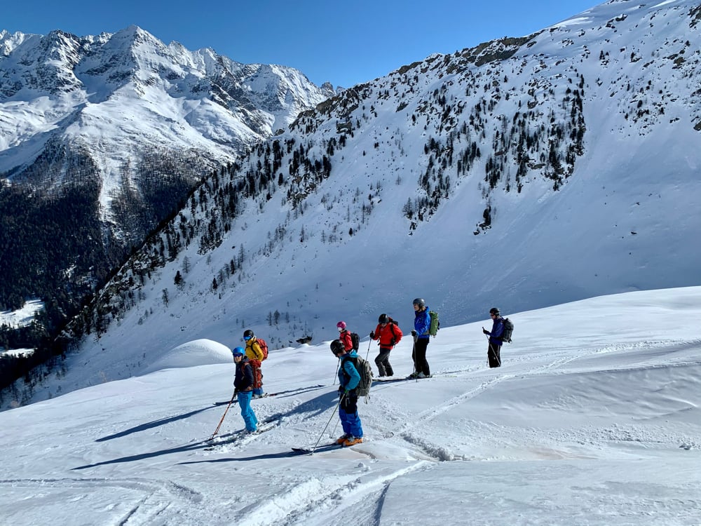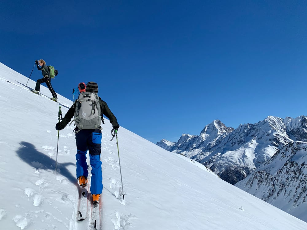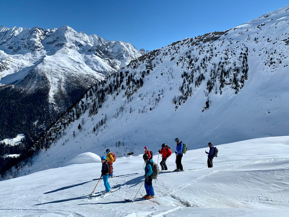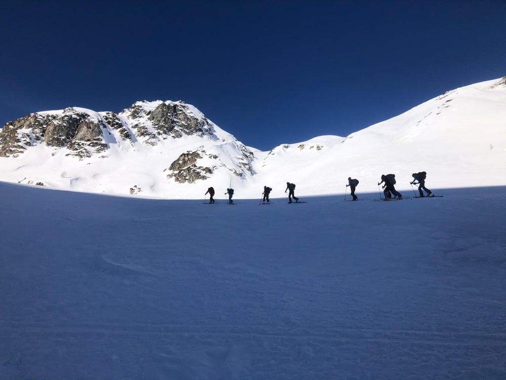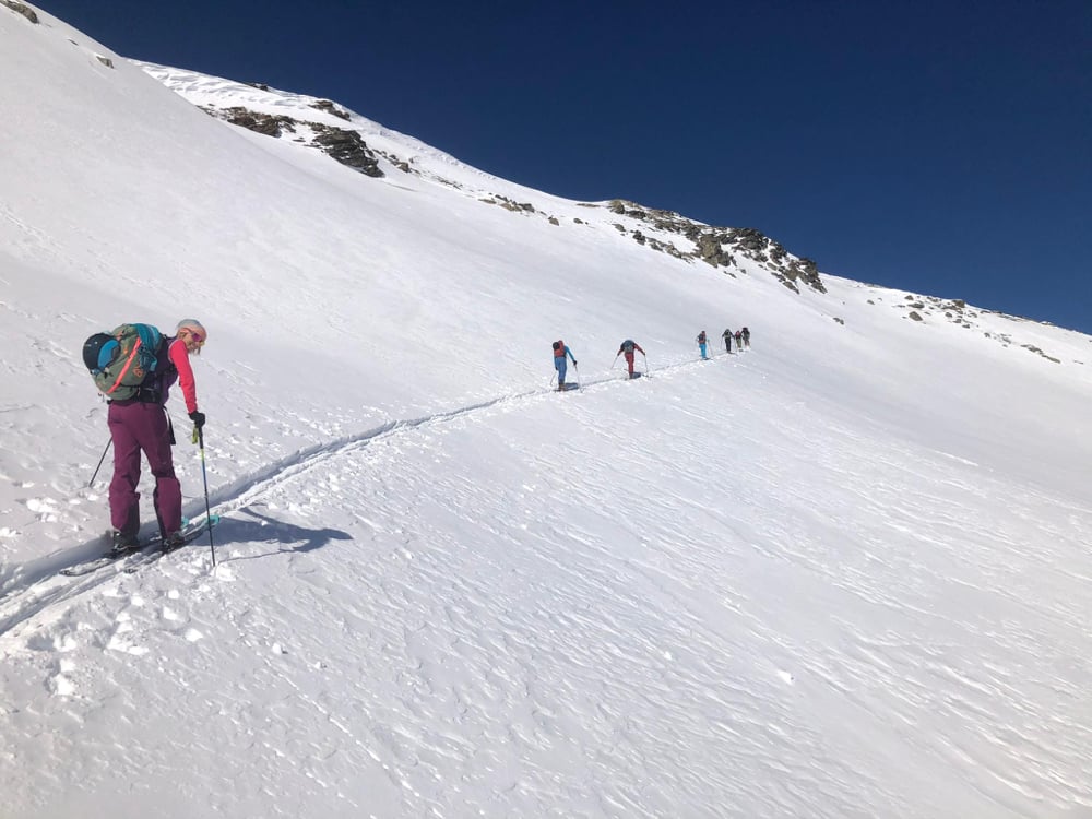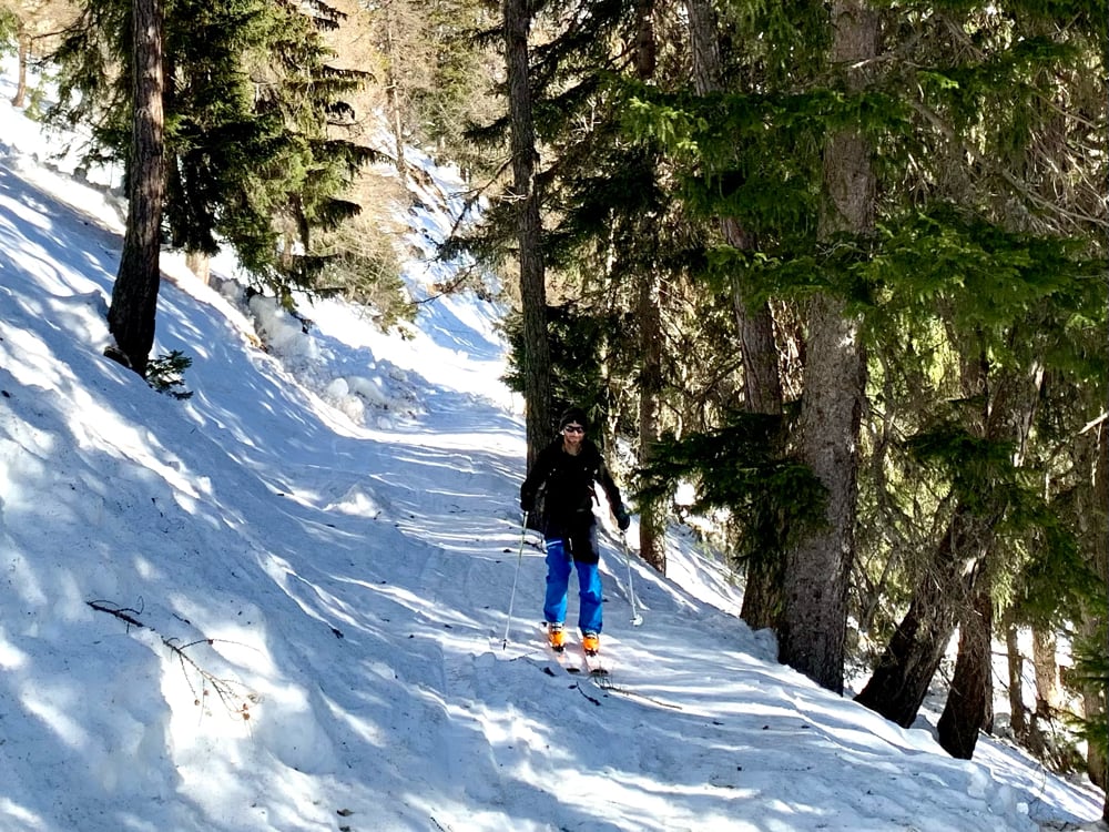 Nachdem uns die rappelvollen ÖV in Ferden ausgespuckt hatten, bekamen unsere Skier, nach kurzem Fussmarsch, endlich Schnee zu spüren. Ein paar Minuten später spürten sie allerdings auch bereits die Harscheisen! Damit schafften wir die delikat gefrorenen Hänge hoch nach Bärsol, wo wir wieder die Strasse erreichten, zwar nicht locker, aber etwas entspannter. Weiter ging es eben auf besagter Strasse. Bevor wir jedoch die wunderschöne Faldumalp erreichten, mussten noch einigen Nassschneelawinen überquert werden. Immerhin begrüsste uns da auch bereits die Sonne, welche den Schnee etwas antaute und half, die Unebenheiten in den Lawinen besser umzirkeln zu können. Trotzdem kämpften einige Teilnehmer heroische Kämpfe mit den "Schneechrugle", welche sich ihnen in den Weg stellten und liessen dabei einige Federn.