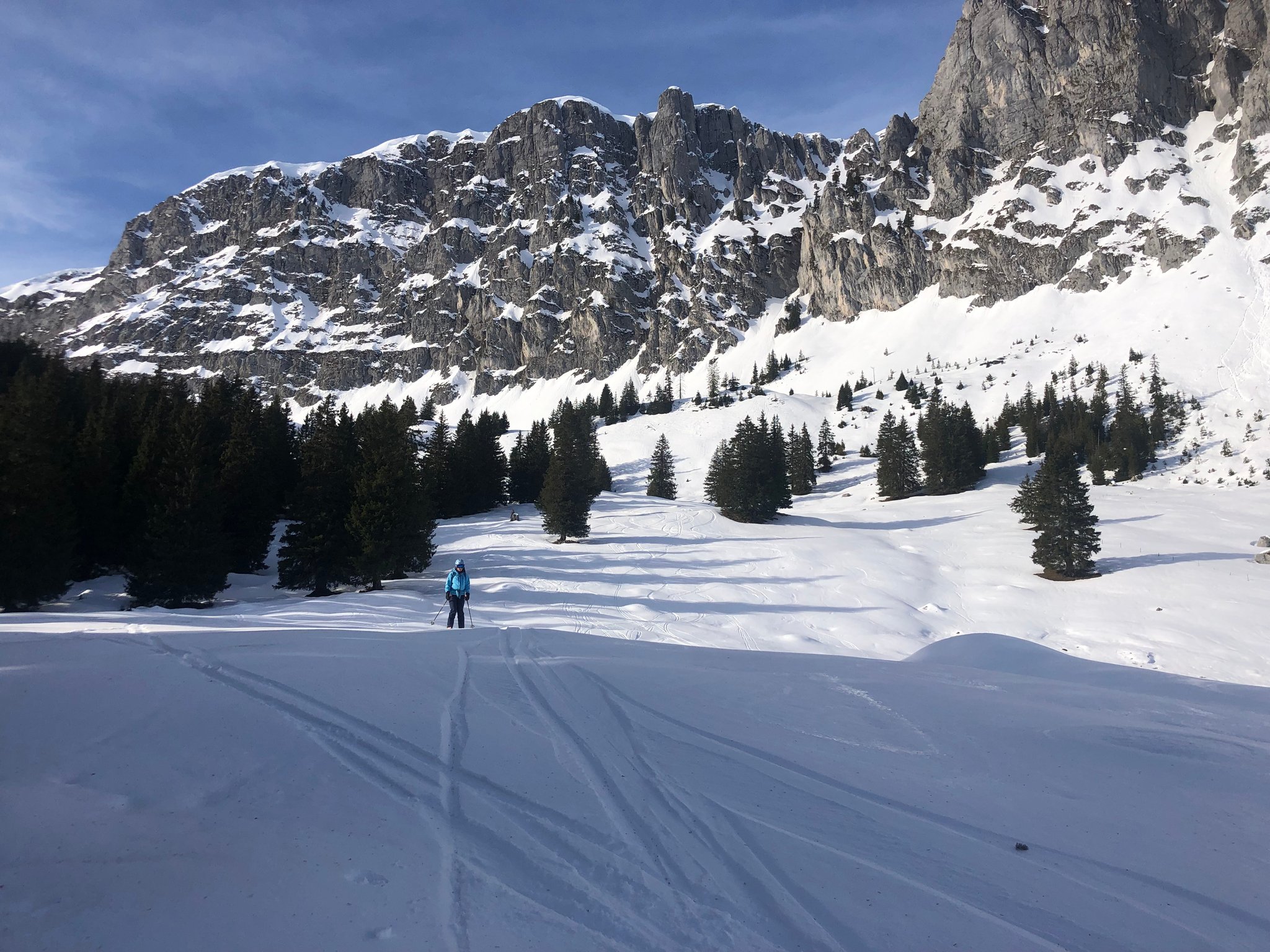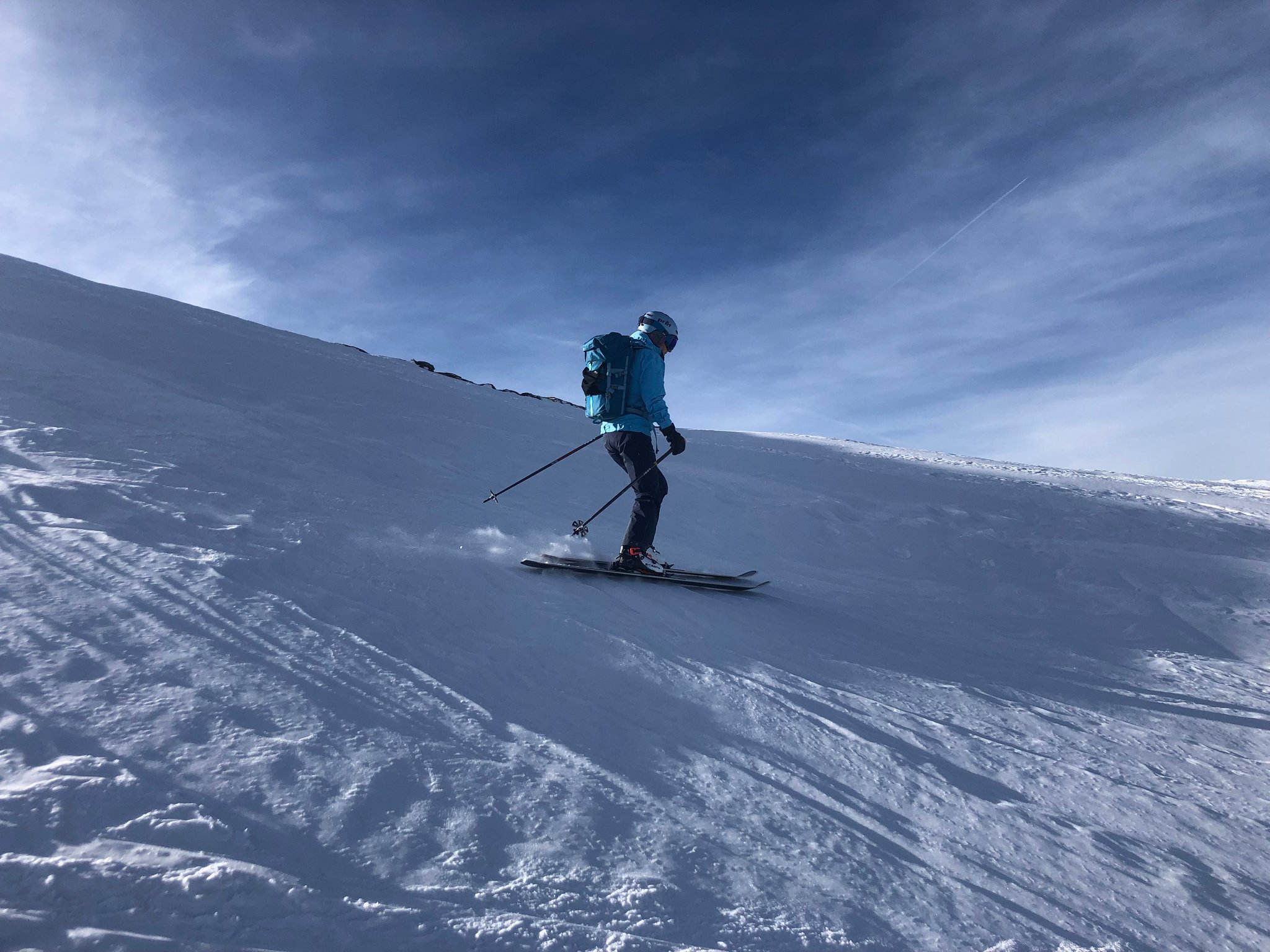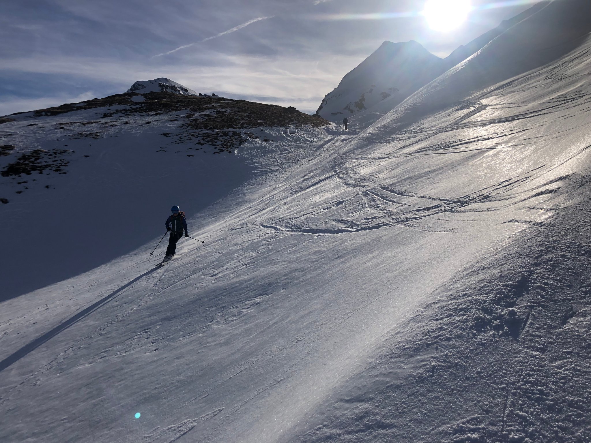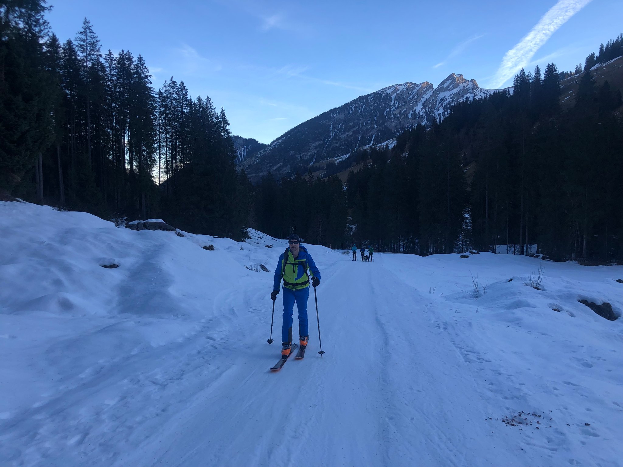 Es war wie fast immer, "besser als erwartet". Die Abfahrt bot viele verschiedene Schneearten. Plattenpulver, hartgefrorene Platten, pistartige Abschnitte, pulvriger Altschnee und sogar Sulz unterhalb vom Alpetli. Zum Teil konnten auch anständige Bögen gezogen werden. :-)